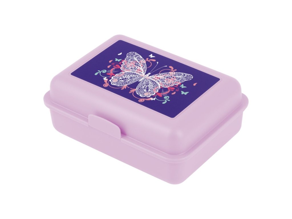 Svačinový plastový box české značky Baagl pro holky s motivem motýla v růžové barvě. Box se uzavírá na jeden zámek a obsahuje dělící přepážku.