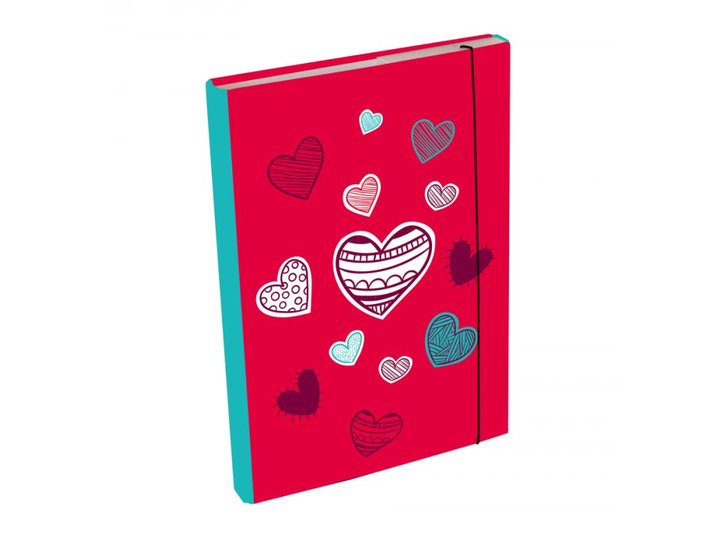 Desky na školní sešity české značky Baagl s motivem srdíček. Dítě je bude nosit do školy s radostí. Formát desek je A4. Desky chrání před poškozením sešitů nebo učebnic, jsou vybaveny vnitřní klopou bránící vypadnutí sešitů a jsou zajištěné gumičkou.