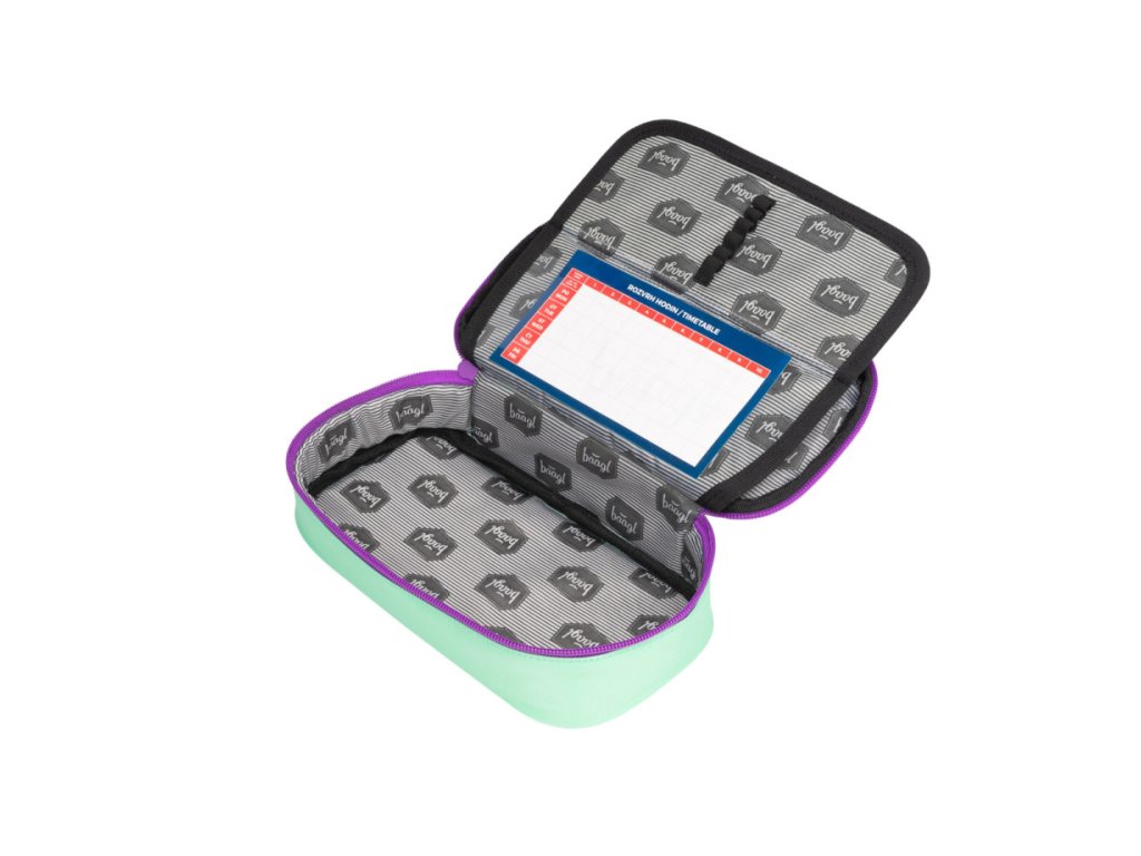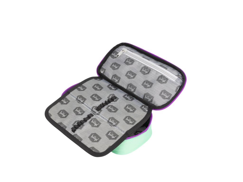 Stylový penál na zip české značky Baagl v mintové barvě s logem Baagl. Penál je opatřen dvojitou výklopnou chlopní, uvnitř je kapsa na zip a také kapsa pro rozvrh školních hodin. Nechte vykročit vaše dítě vstříc školním lavicím stylově.