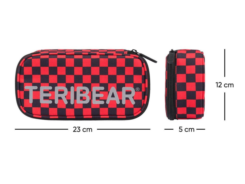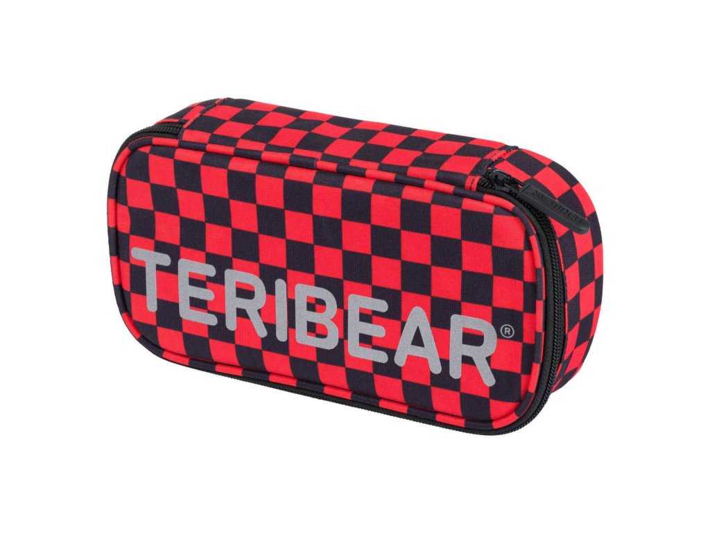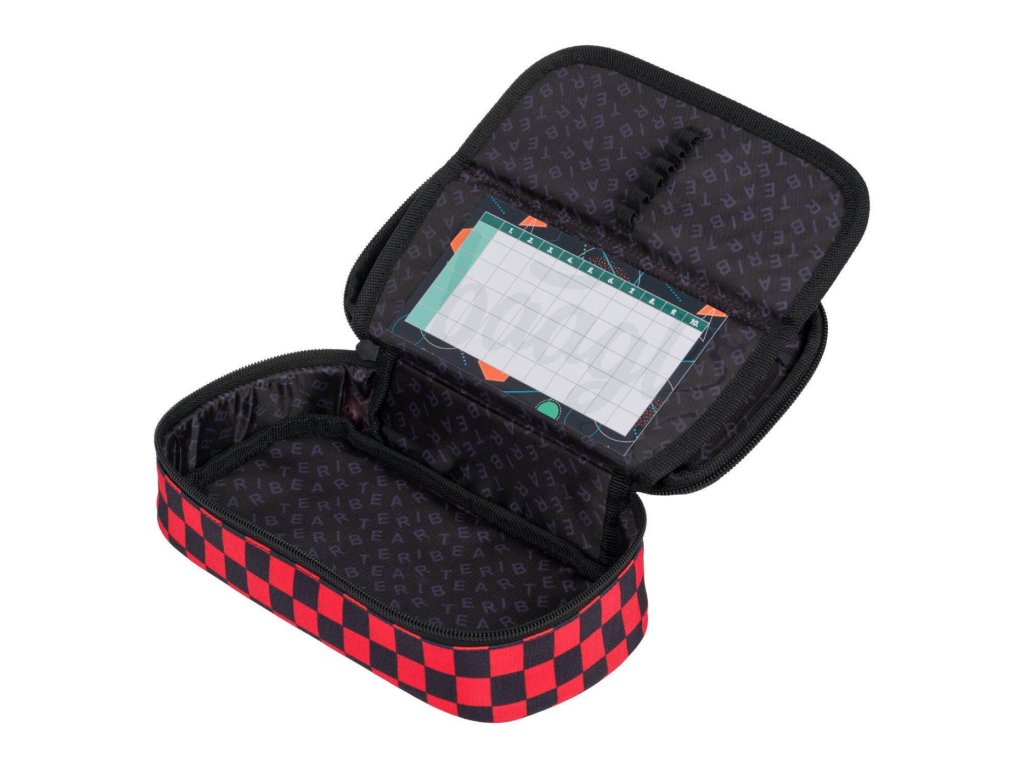Pevný penál Skate Teribear české značky Baagl se vzorem červenočerné kostky s dvojitou výklopnou chlopní, uzamykatelný na kvalitní zip.