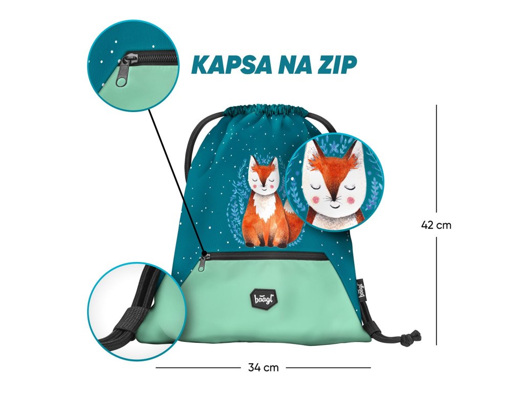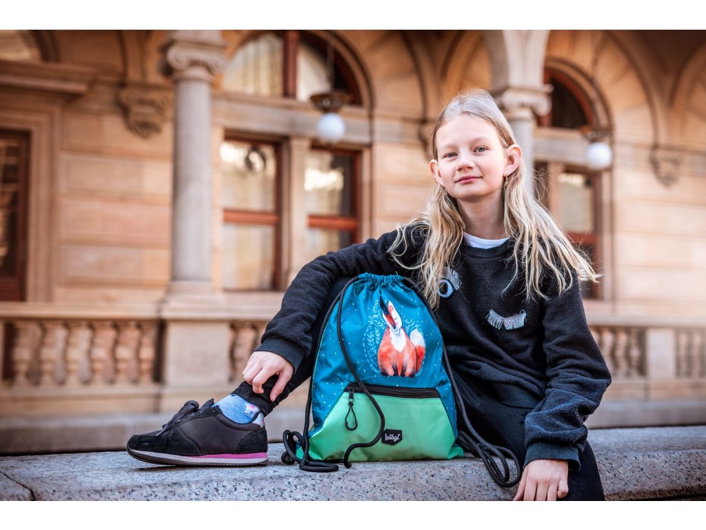 Sáček na cvičky nebo přezůvky české značky Baagl s motivem lišky na přední straně. Sáček je vyroben z pevného omyvatelného materiálu. Pevné tkanice umožňují i nošení na zádech.