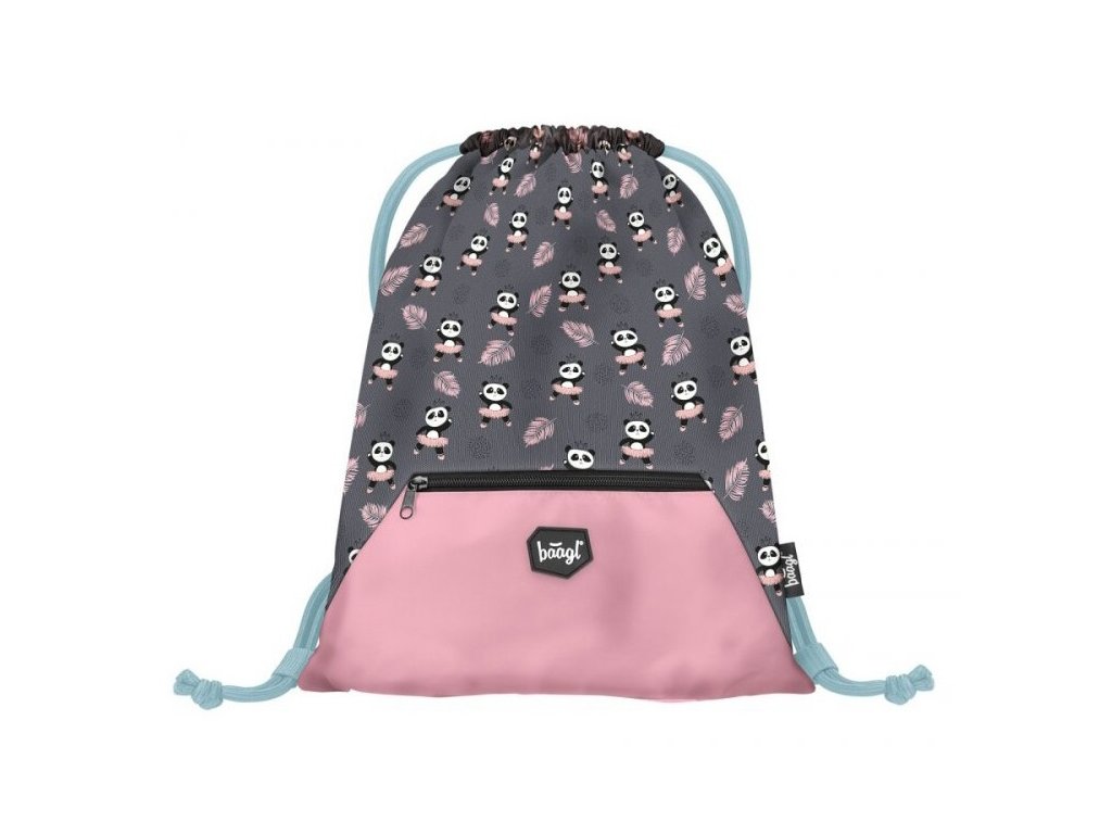 Sáček na cvičky nebo přezůvky české značky Baagl s motivem pandiček. Sáček je vyroben z pevného omyvatelného materiálu. Pevné tkanice umožňují i nošení na zádech.