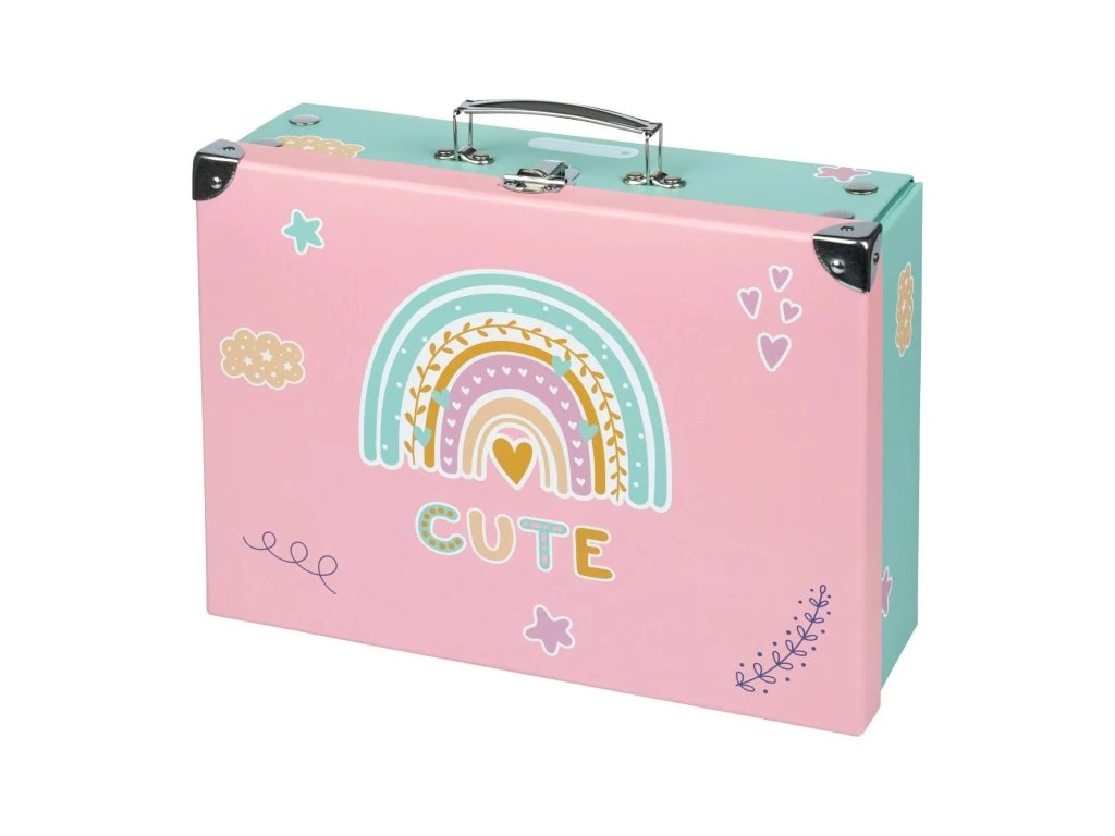 Jedinečný papírový znovu rozkládací kufřík české značky Baagl v růžové barvě s oblíbeným motivem Duha bezpečně uschová a ochrání výtvarné potřeby. Jednoduchý systém skládání pomocí patentků.