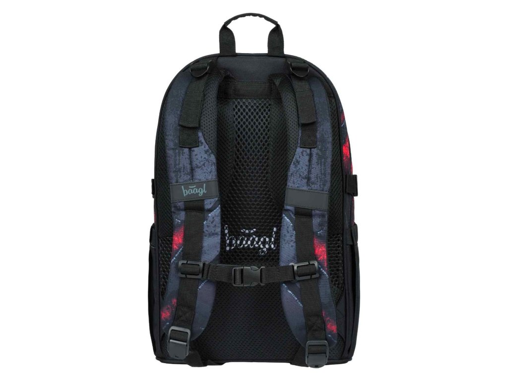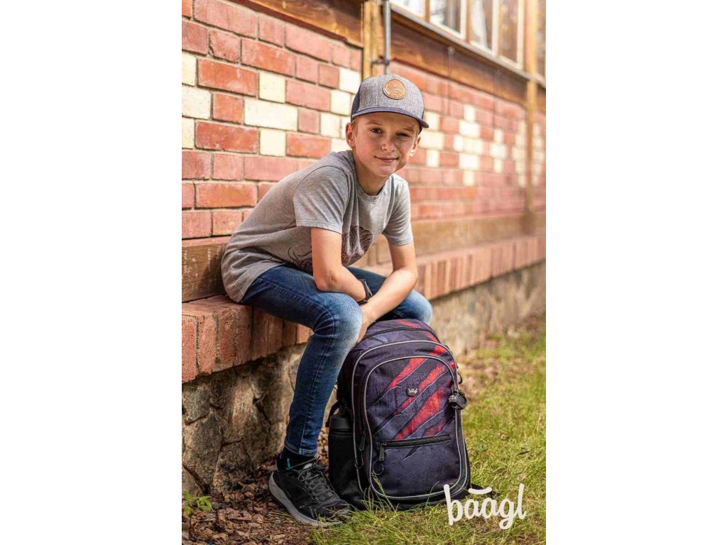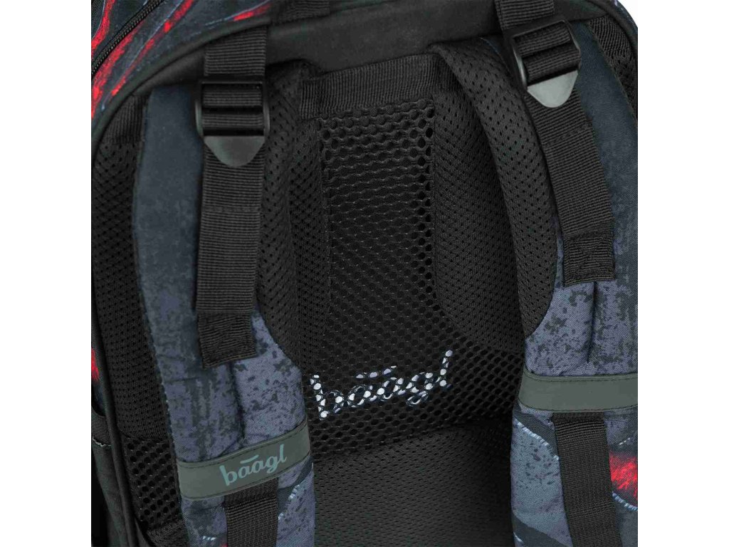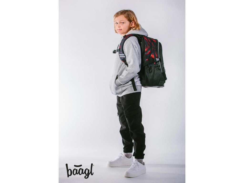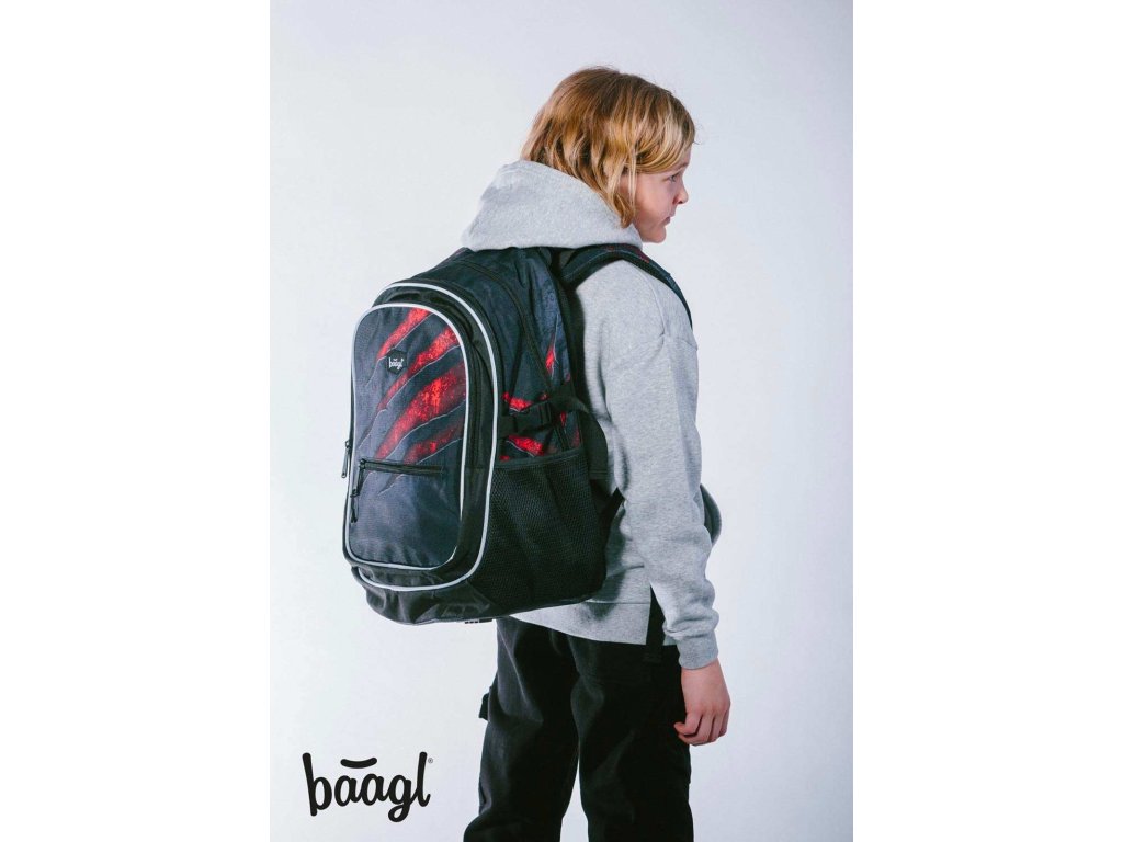 Stylový batoh značky Baagl Core v tmavém barevném provedení s výraznými akcenty červené barvy. Batoh je vhodný od 3. třídy ZŠ.