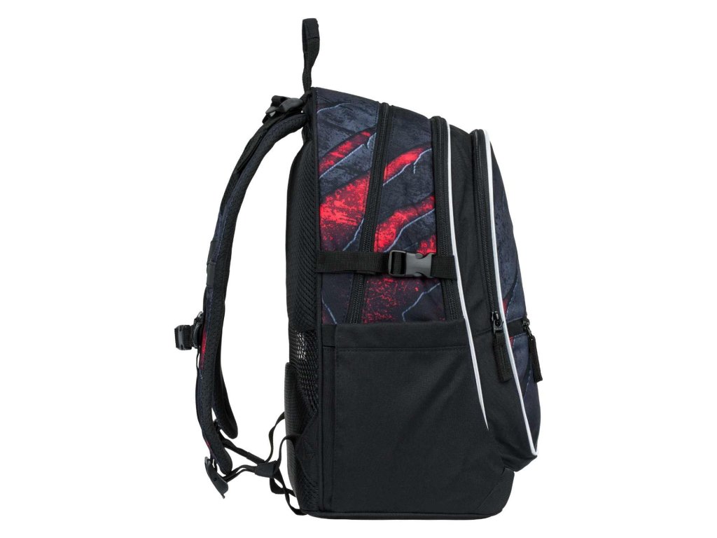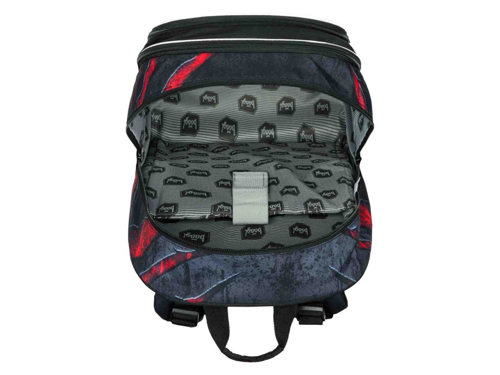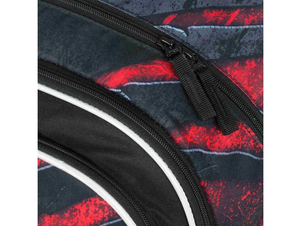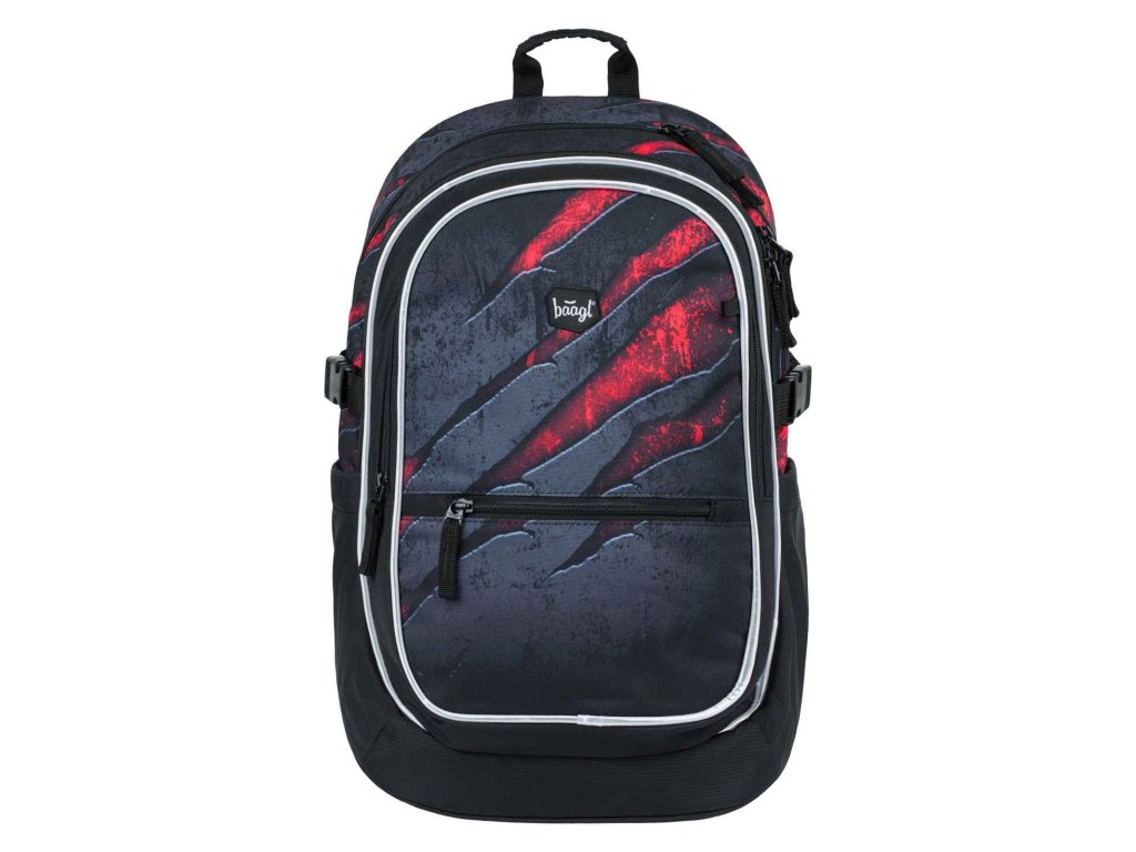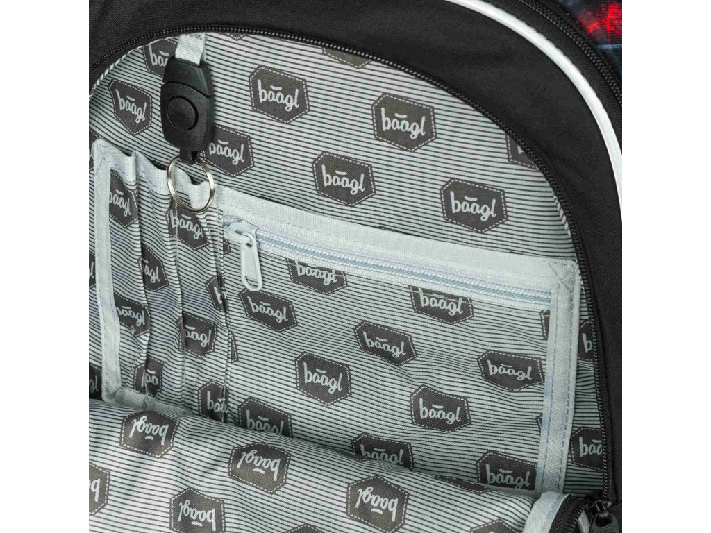 Stylový batoh značky Baagl Core v tmavém barevném provedení s výraznými akcenty červené barvy. Batoh je vhodný od 3. třídy ZŠ.