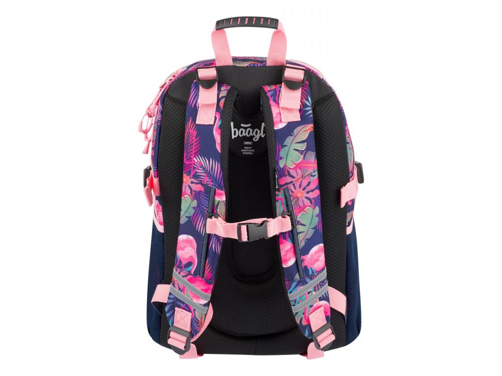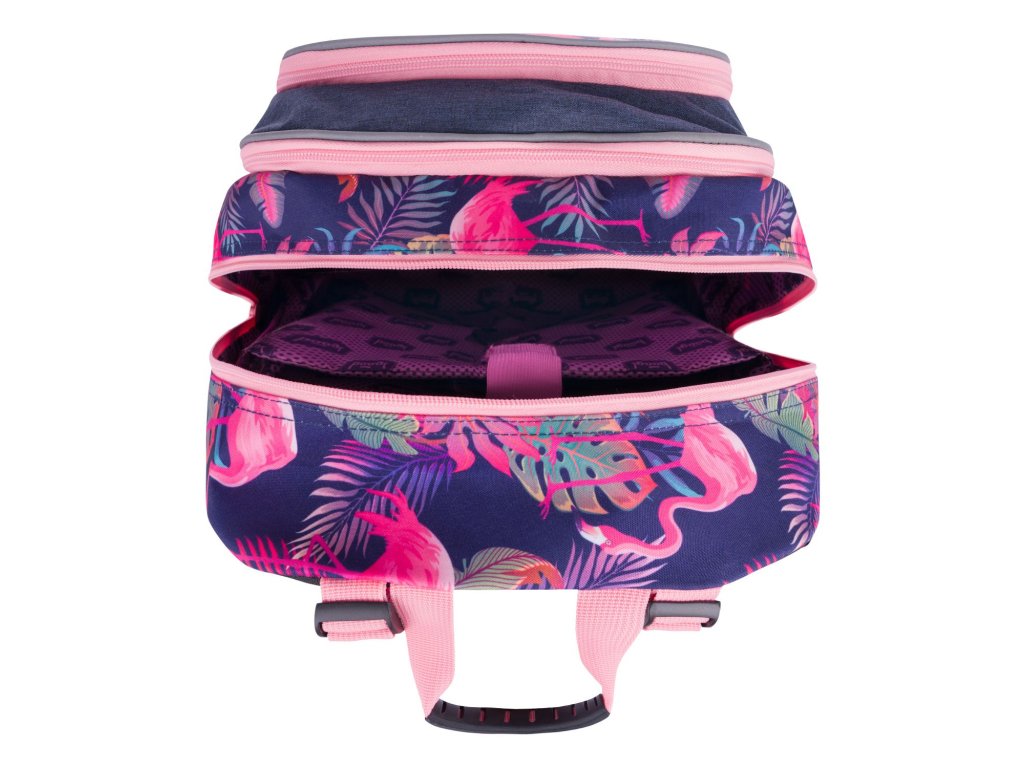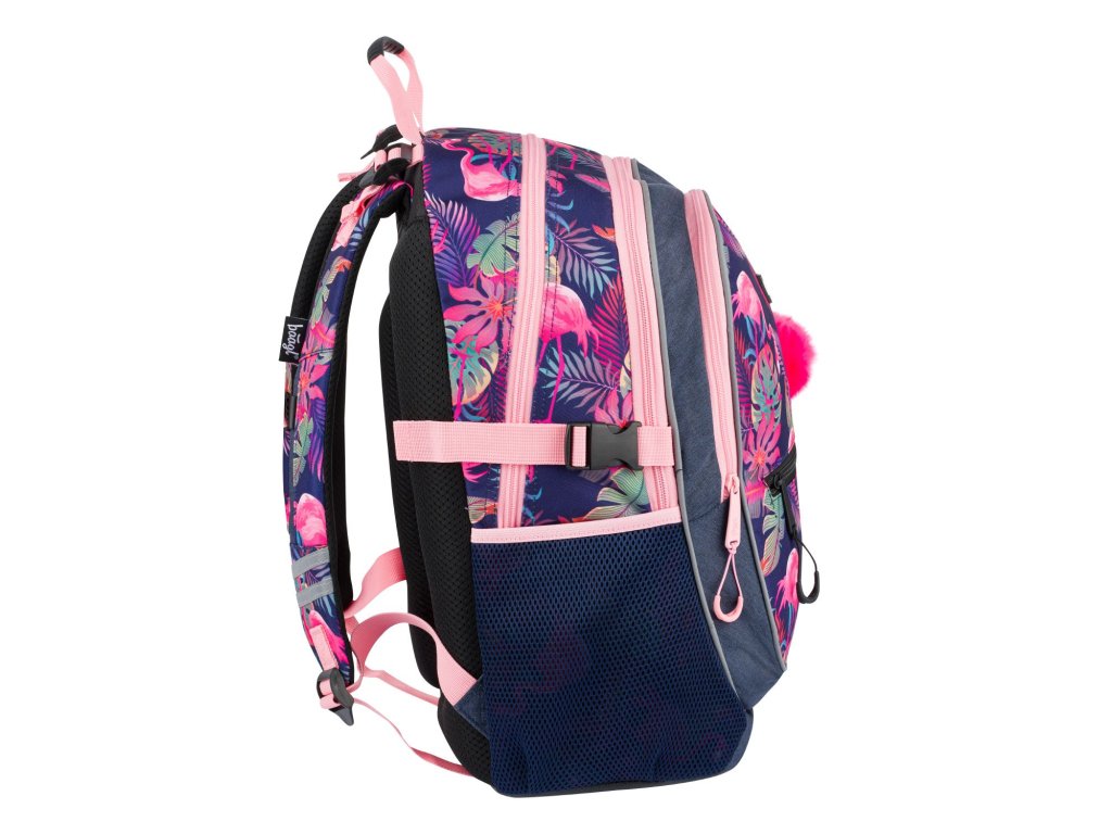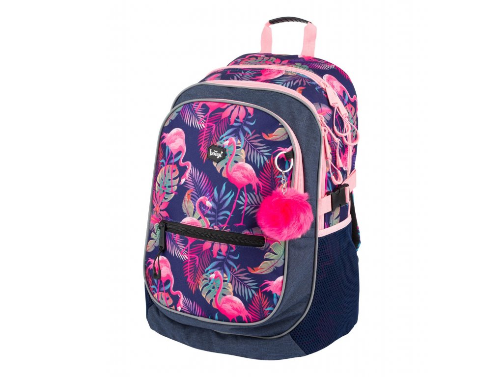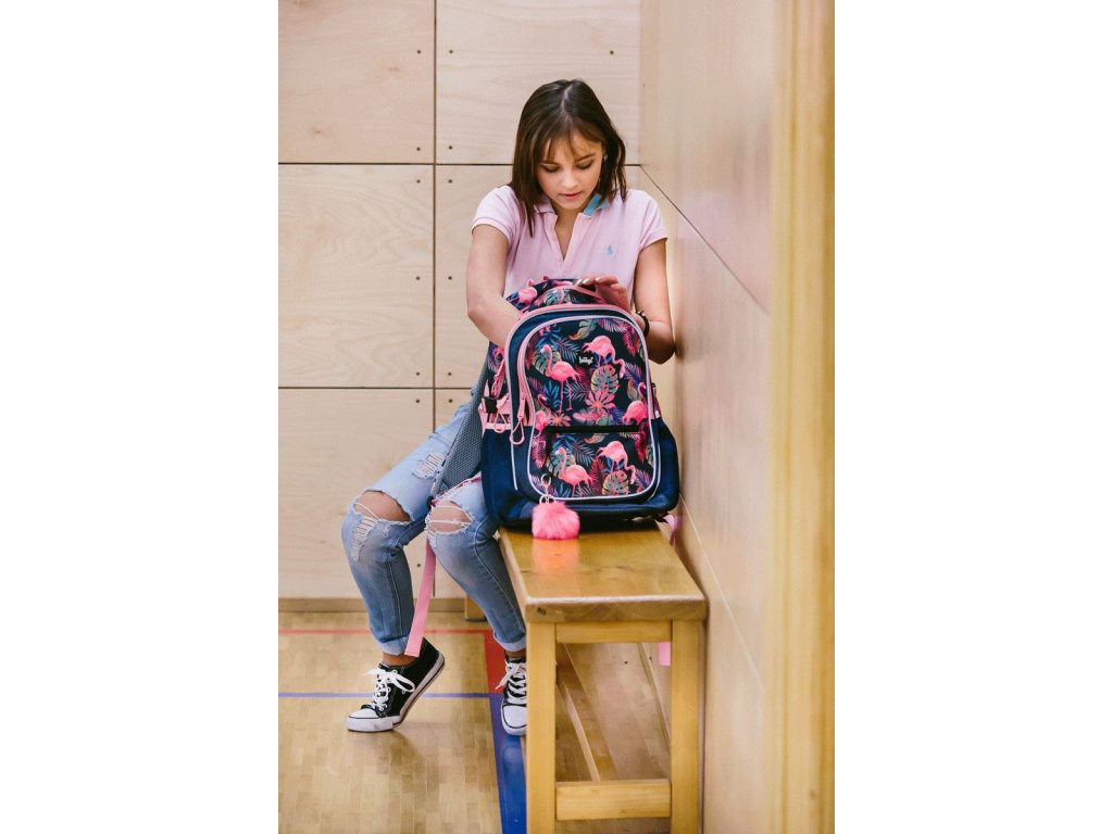 Školní batoh Flamingo s potiskem trendy plameňáků, vhodný od 3. třídy 1. stupně ZŠ a také pro 2. stupeň ZŠ. Batoh byl úspěšně testován v ITC Zlín.