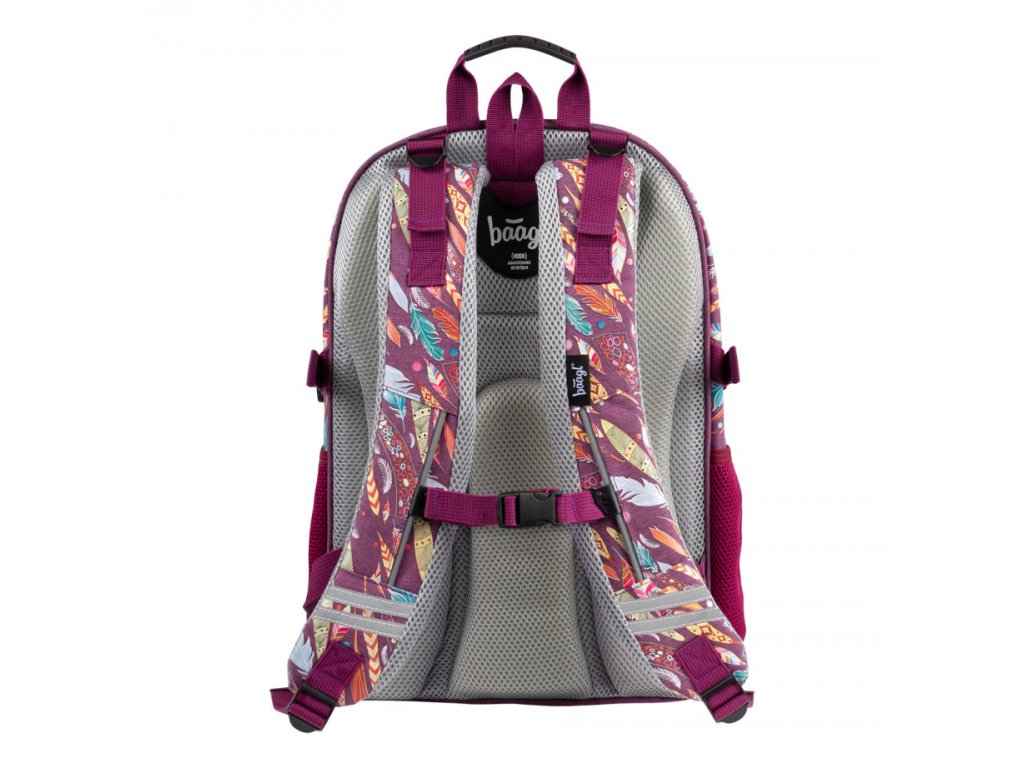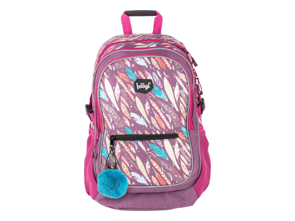 Dívčí školní batoh české značky Baagl ve fialové barvě s motivem pírek. Nechte vykročit vaše dítě vstříc školním lavicím stylově. Batoh je vhodný od třetí třídy 1. stupně základní školy, ale i pro 2. stupeň základní školy.