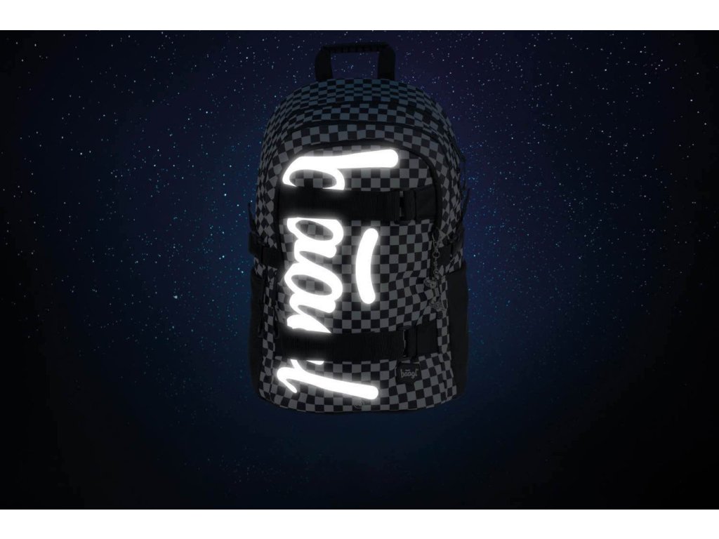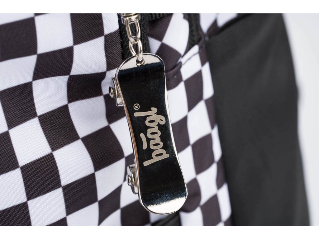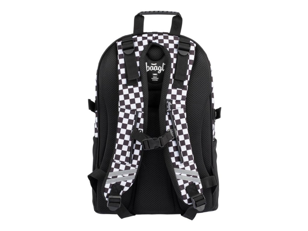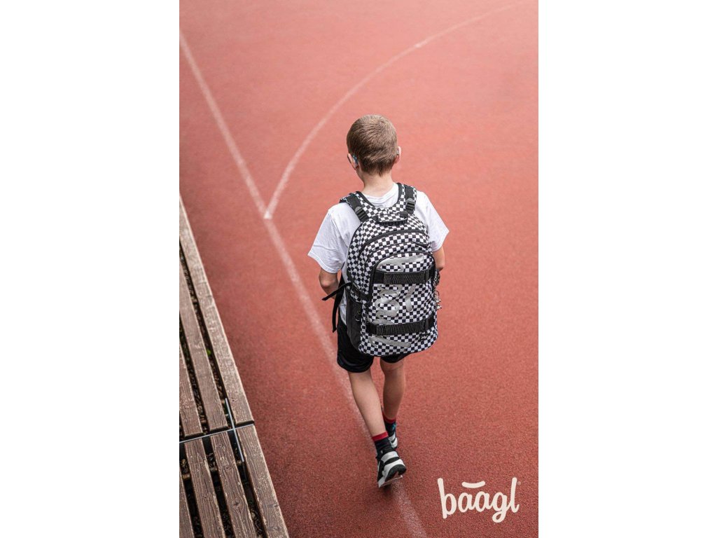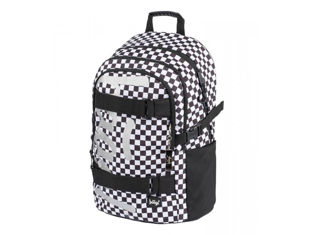 Školní batoh Skate Ska české značky Baagl s reflexním logem BAAGL se vzorem černobílé kostky. Batoh je vhodný pro žáky od 3. třídy ZŠ.