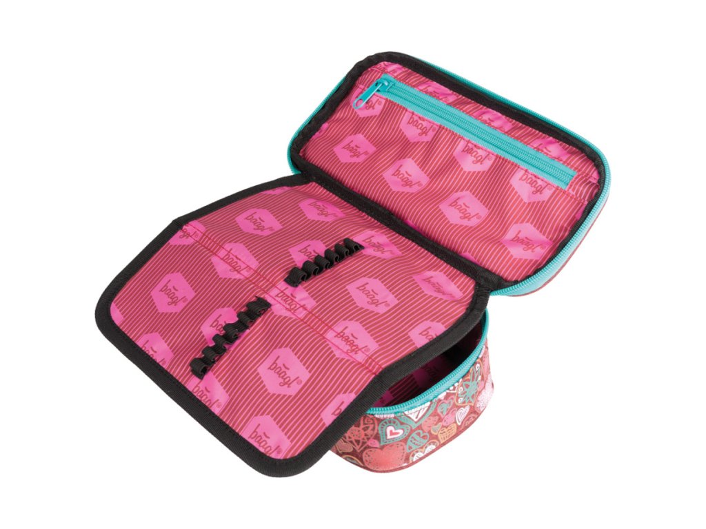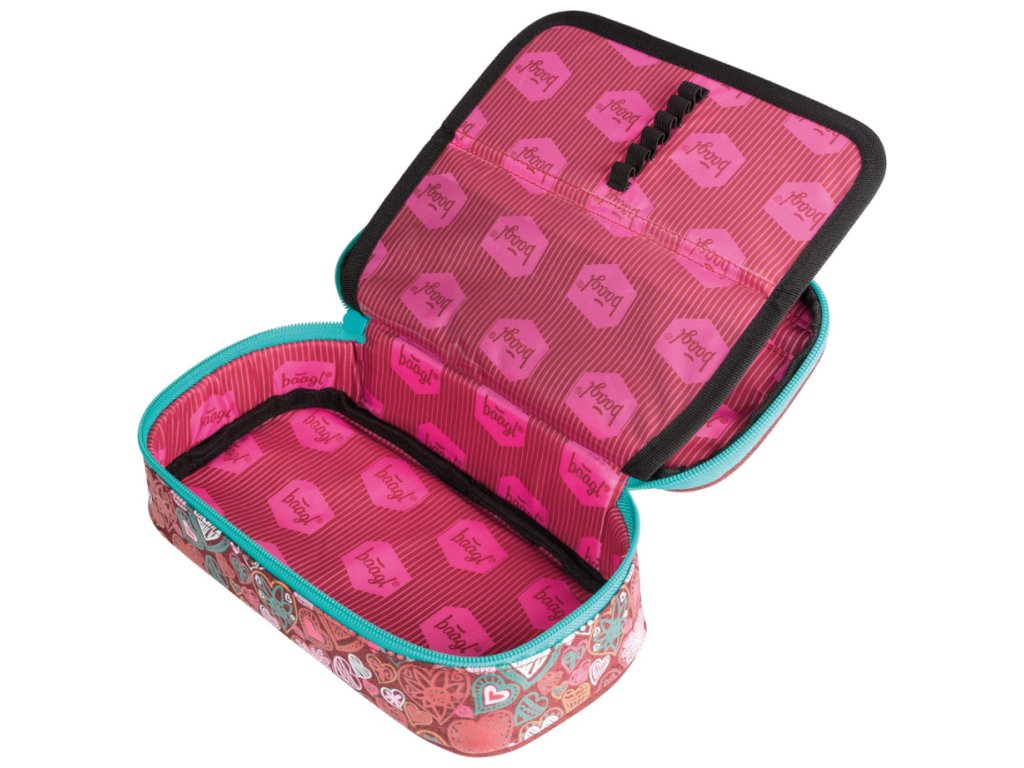 Dívčí školní penál české značky Baagl s motivem srdíček. Penál poskytuje dostatek prostoru pro všechny psací potřeby, je opatřen výklopnou vnitřní přepážkou a vnitřní kapsou na zip. Je vhodný pro vyšší ročníky.