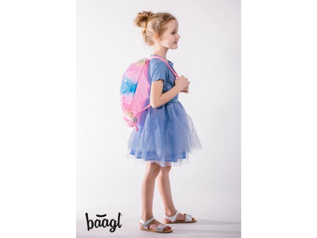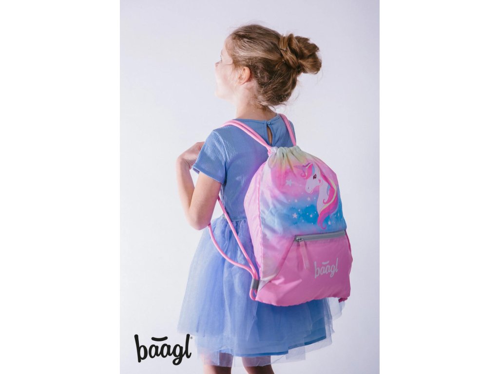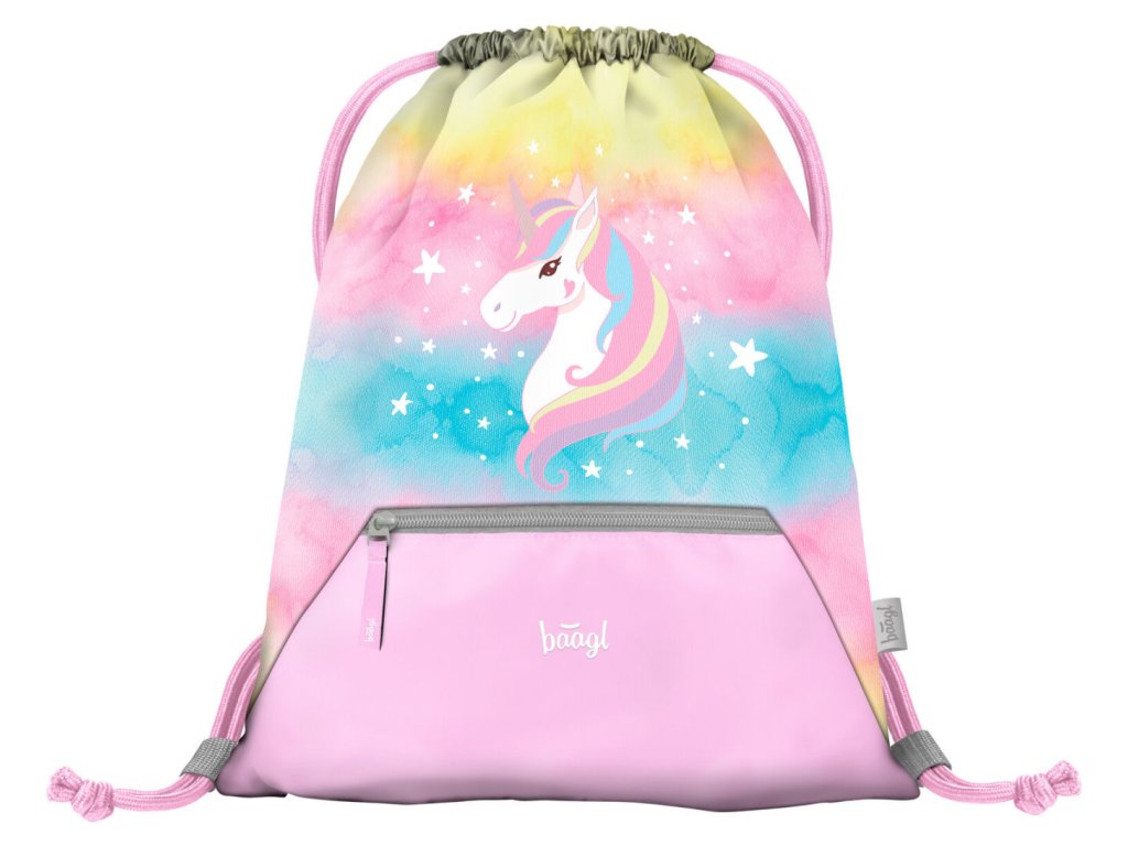 Sáček na cvičky nebo přezůvky české značky Baagl v růžové barvě. Oblíbený motiv malých školaček, jednorožec s duhou, na sáčku na tělocvik nebo boty.