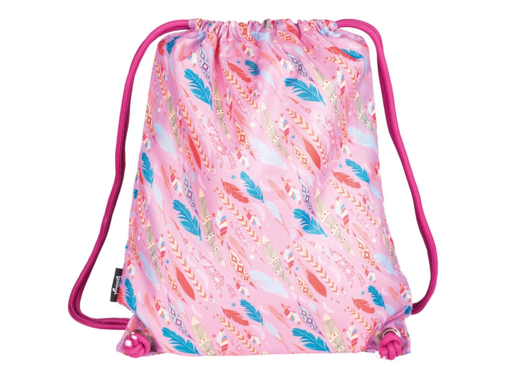 Sáček na cvičky nebo přezůvky s motivem pírek z pevného omyvatelného materiálu.