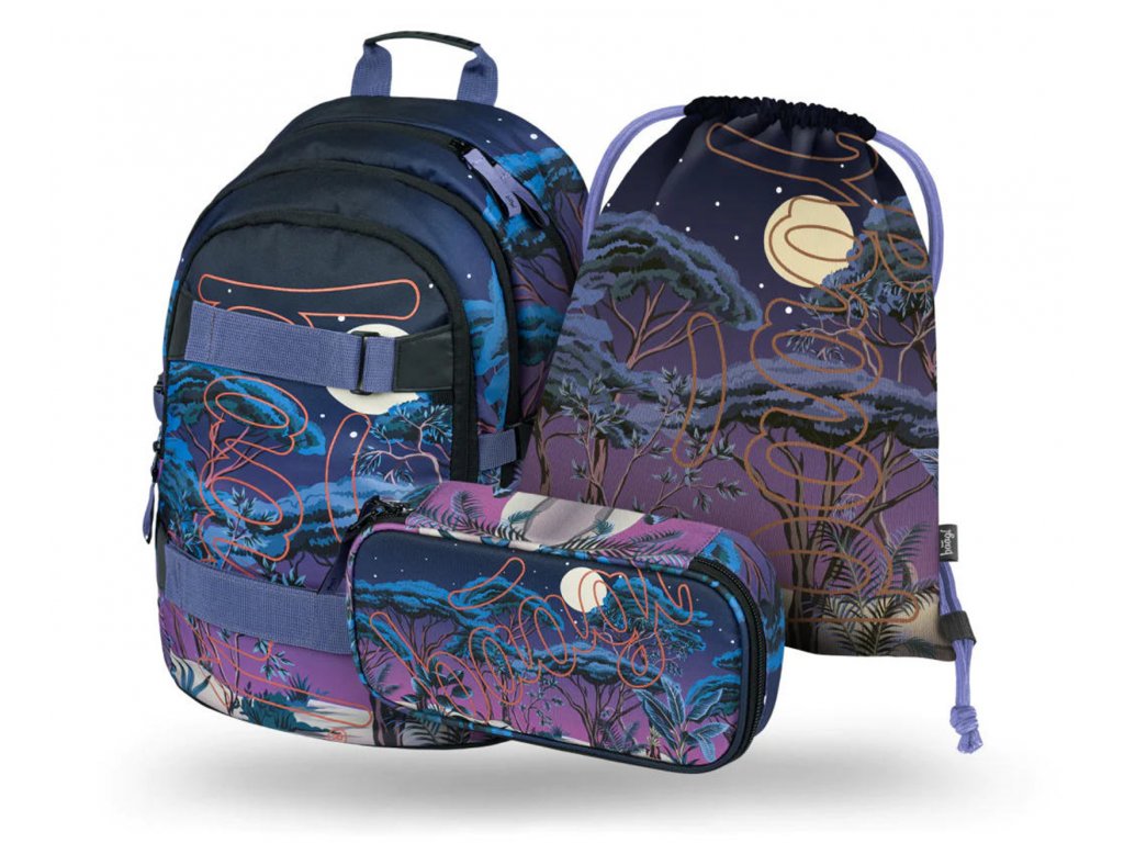 Dívčí školní set Skate Night české značky Baagl složený z batohu Skate, kvalitního penálu a sáčku na obuv s motivem noční krajiny.