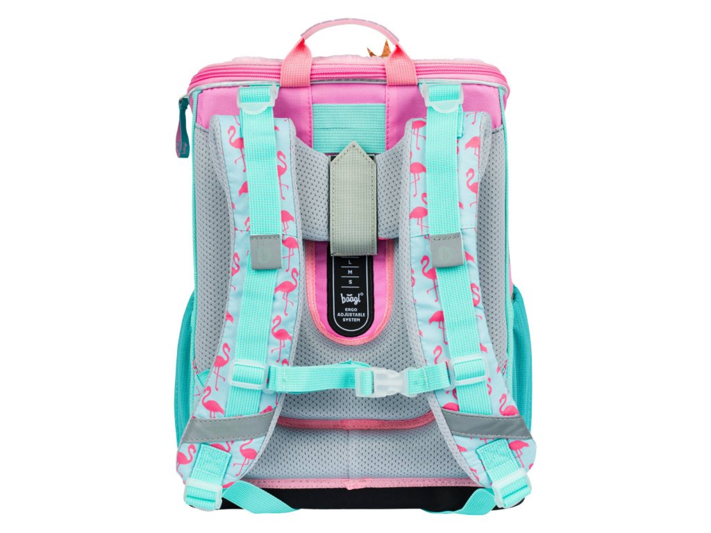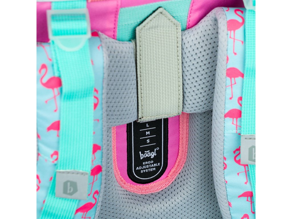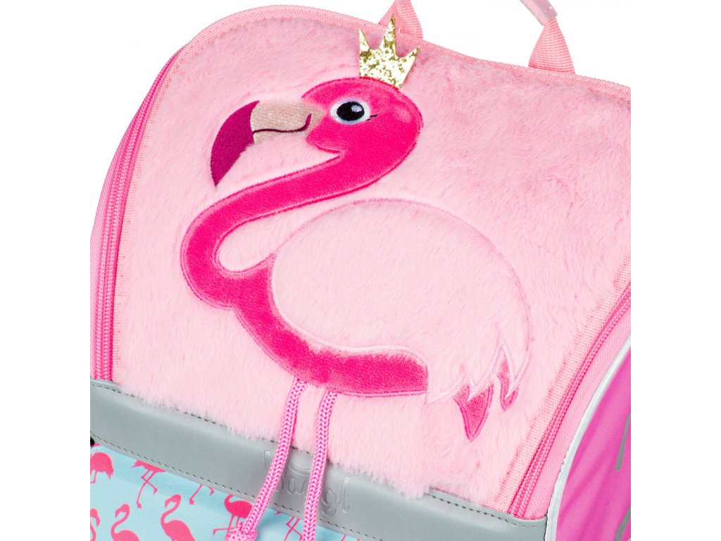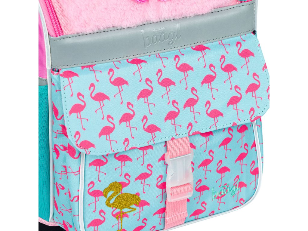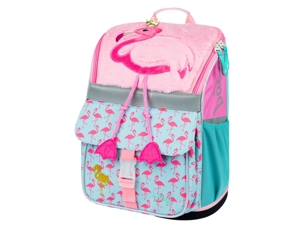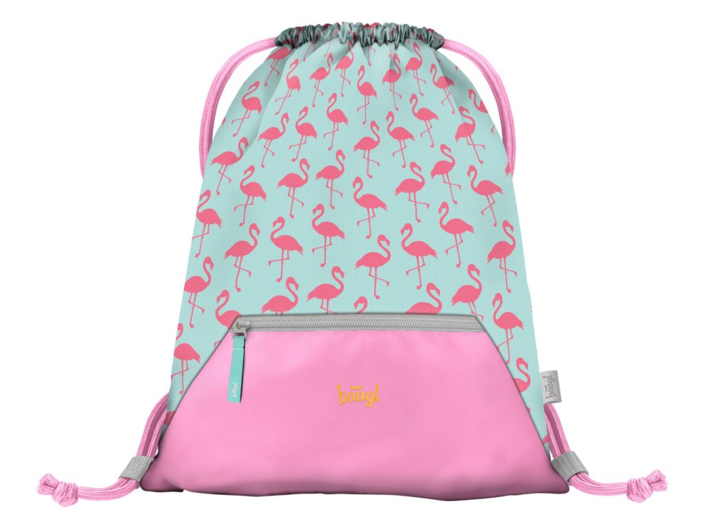 Velký školní set české značky Baagl Zippy Plameňák v růžové barvě složený z aktovky, penálu, sáčku na obuv, boxu na svačinu a desek na školní sešity s motivem Plameňáka.