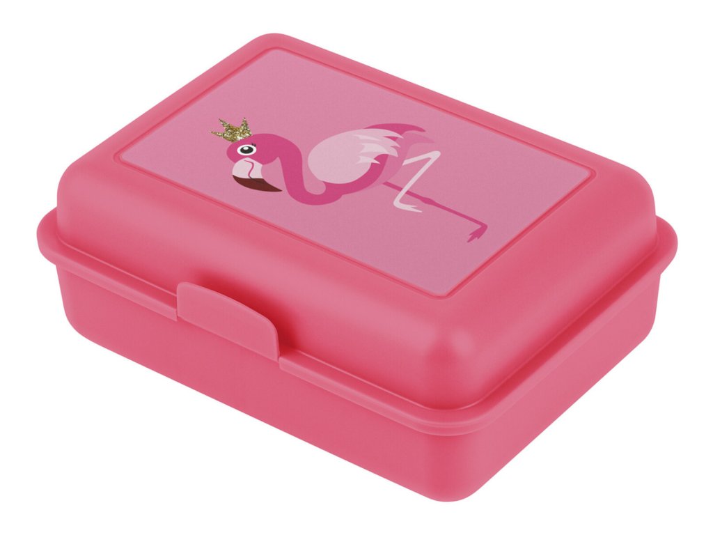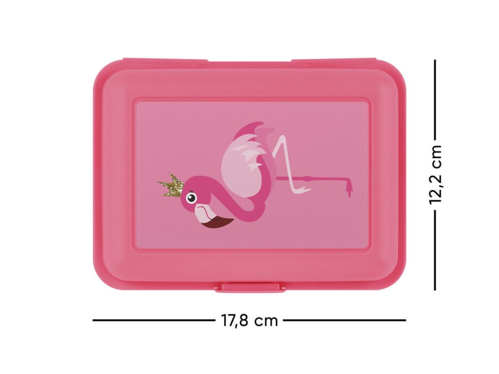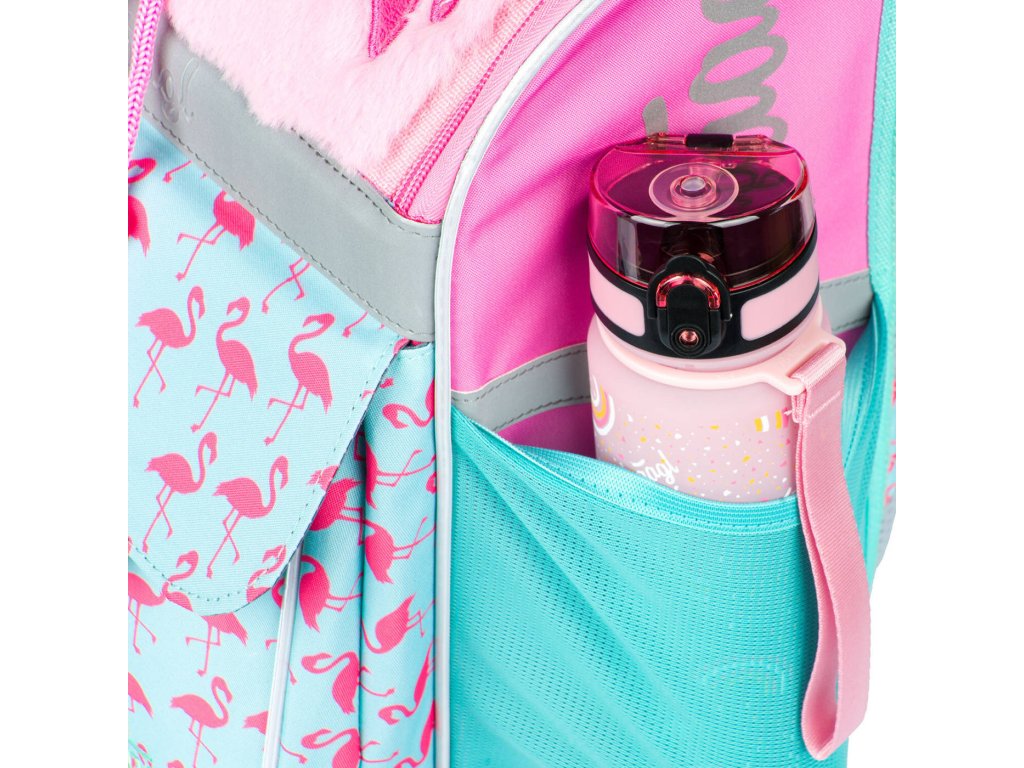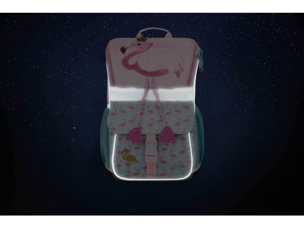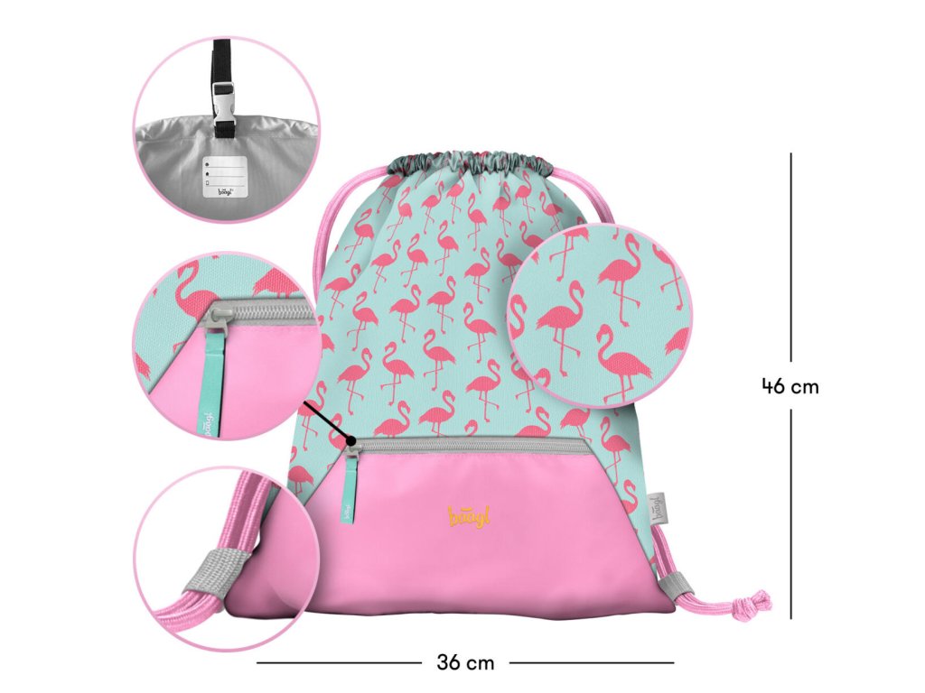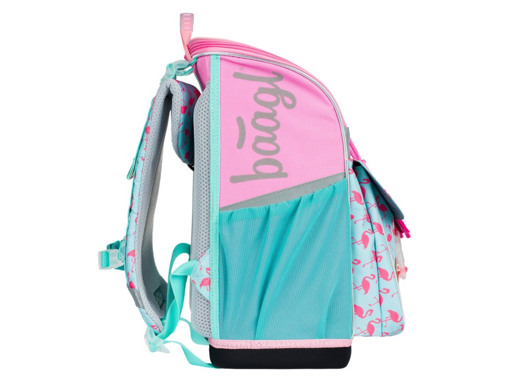 Velký školní set české značky Baagl Zippy Plameňák v růžové barvě složený z aktovky, penálu, sáčku na obuv, boxu na svačinu a desek na školní sešity s motivem Plameňáka.