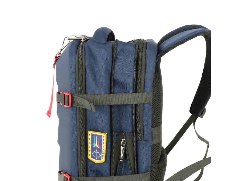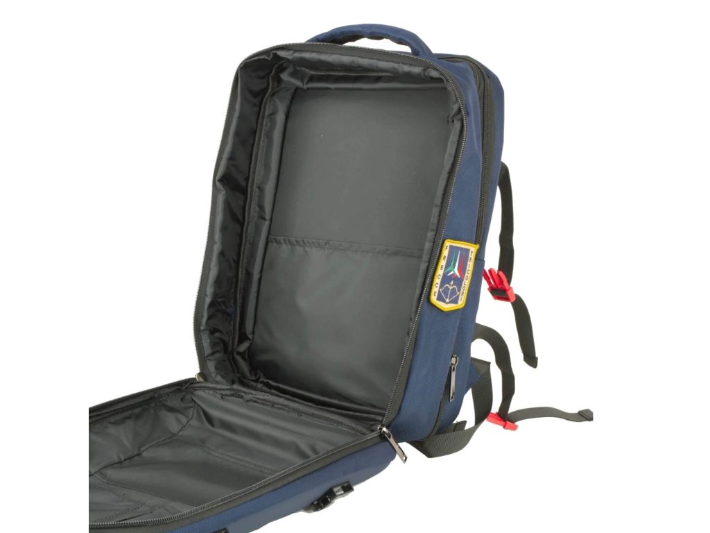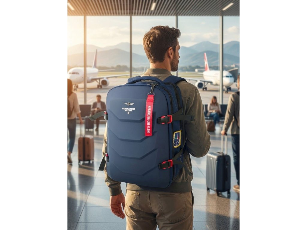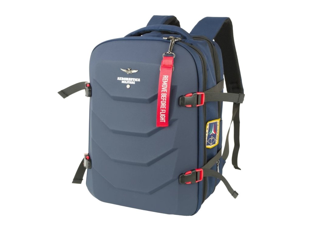 Městský elegantně-sportovní batoh od prestižní značky Aeronautica Militare série Patch Comby v modré barvě. Batoh Aeronautica Militare Patch Comby je stavěný pro lidi, kteří chtějí mít věci bezpečně uložené, přehledně srovnané a pořád pod kontrolou. Na první pohled působí čistě a pevně, ale jakmile ho otevřeš, je jasné, že je navržený hlavně prakticky. Kombinace pevné přední ABS skořepiny a textilních částí dává batohu výhodu v ochraně obsahu – notebook, dokumenty nebo elektronika jsou lépe chráněné proti nárazům. Hlavní komora nabízí dostatek místa na každodenní výbavu i věci na kratší cestování, zipové kapsy pomáhají udržet pořádek. Boční kompresní popruhy umožňují batoh stáhnout podle toho, kolik zrovna neseš, takže se nehoupe a drží tvar. Polstrovaná záda a ramenní popruhy zajistí pohodlí i při delším nošení. Typické detaily Aeronautica Militare – nášivky a ikonický červený přívěsek „Remove Before Flight“ – dodávají batohu výrazný, ale stále civilní vzhled.