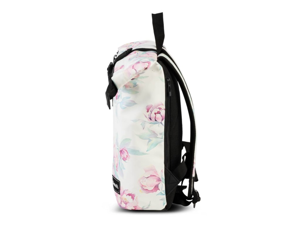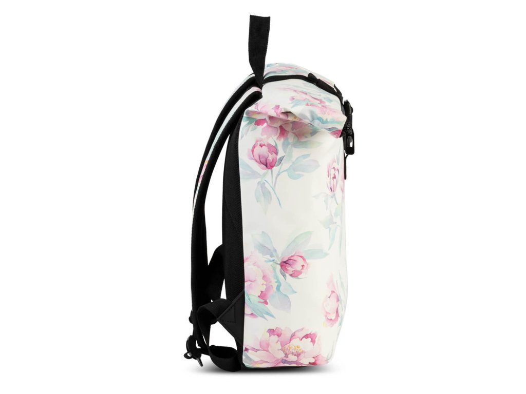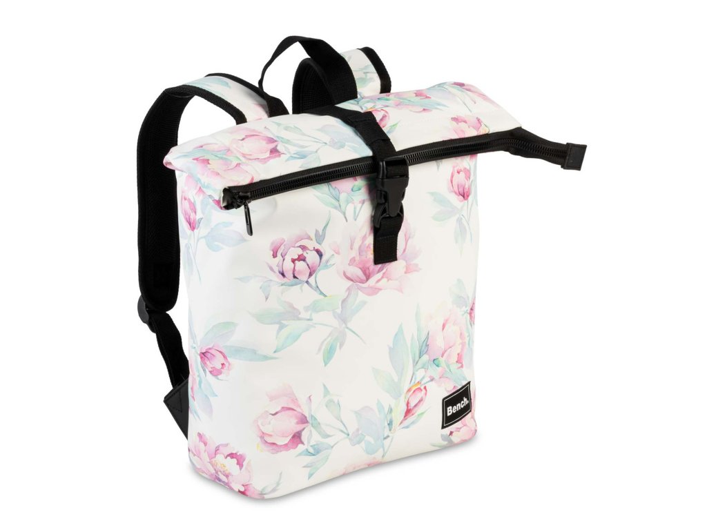 Elegantní dámský batoh anglické značky Bench Hydro roll-top mini v kombinaci bílé a růžové barvy s potiskem pivoněk, velmi kvalitní novinka s módním a praktickým zavíráním nejen pro mladistvé, vhodné pro každý den i na cestování. Tento kvalitní voděodolný materiál, ze kterého je tento mini batoh vyroben, žaručuje dlouhou životnost a odolnost.