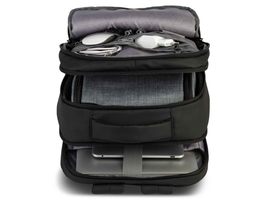 - Hlavní kapsa na dvoucestný zip a s přihrádkou na notebook do 16 palců a přihrádkou na tablet