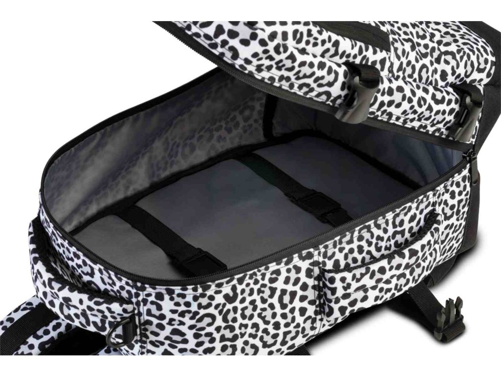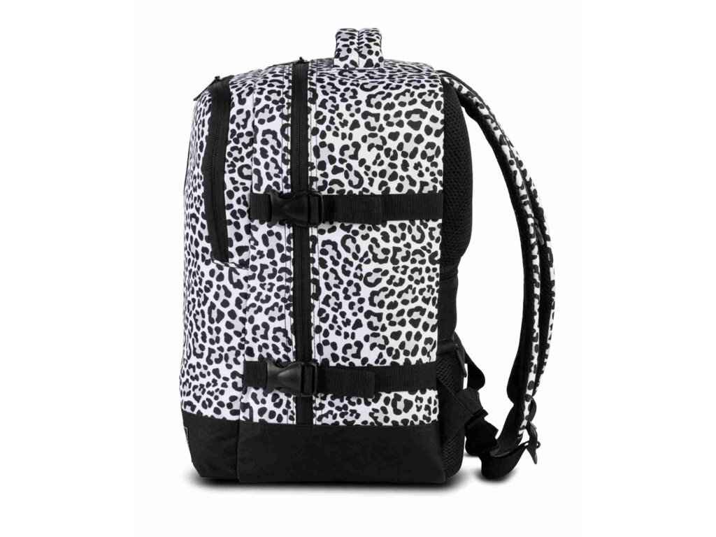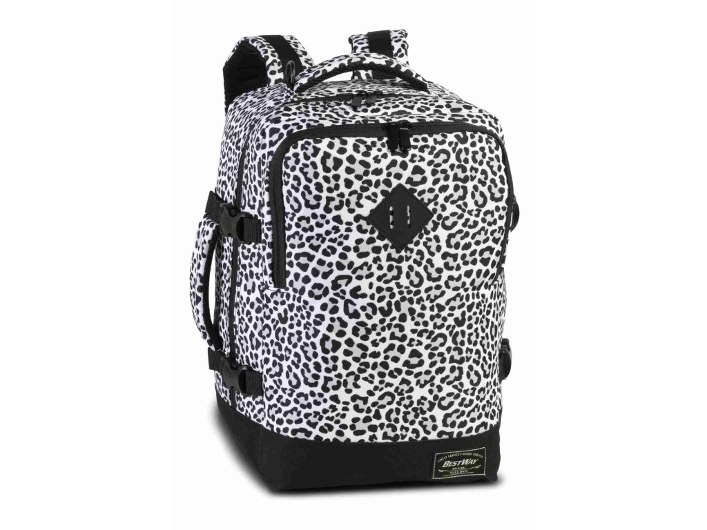 Cestovní multifunkční textilní batoh německé značky Bestway cabin pro v zajímavé černobílé kombinaci barev s leopradím vzorem s ideálním rozměrem pro leteckou společnost Ryanair na palubu letadla.