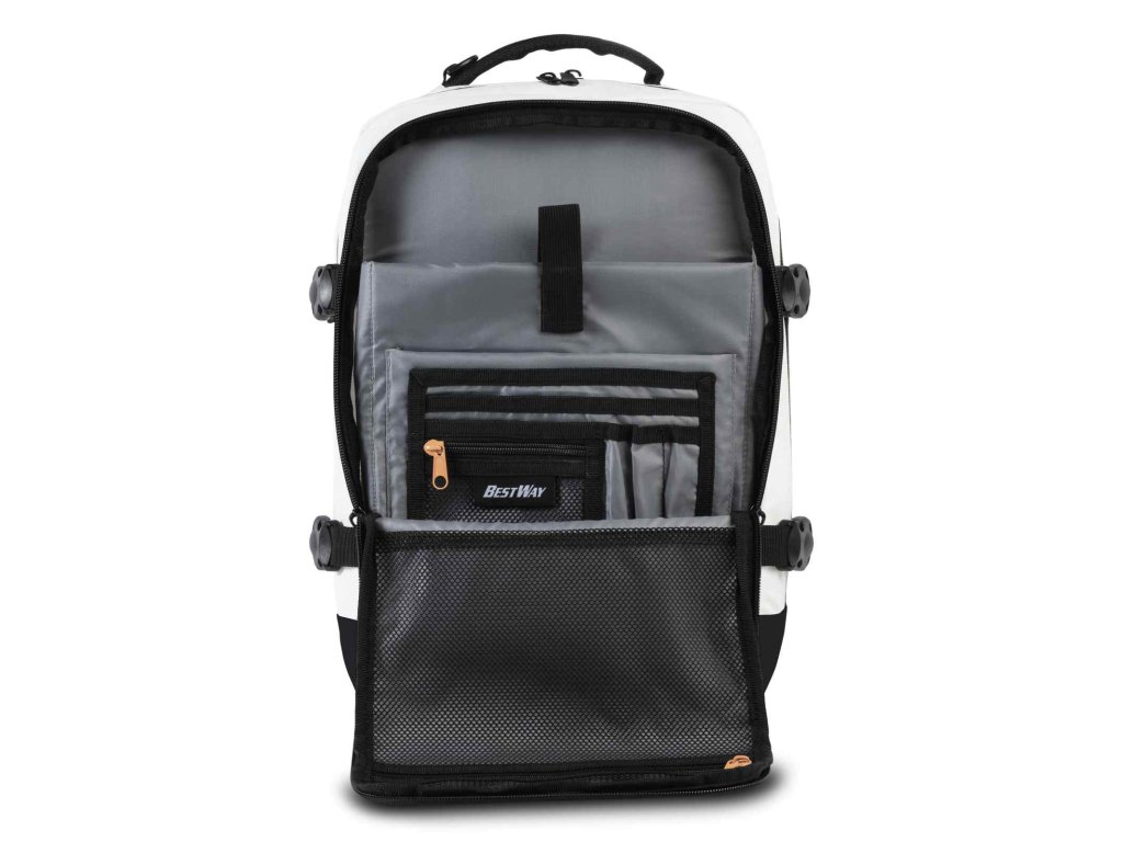 Cestovní multifunkční textilní batoh německé značky Bestway cabin pro Storm v bílé barvě. Toto palubní zavazadlo si můžete vzít s sebou do letadla, jak vyžaduje společnost Ryanair. Má rozměry, které akceptuje většina leteckých společností. Pokud hledáte praktický batoh do letadla, je tento palubní batoh značky Bestway ideálním parťákem!