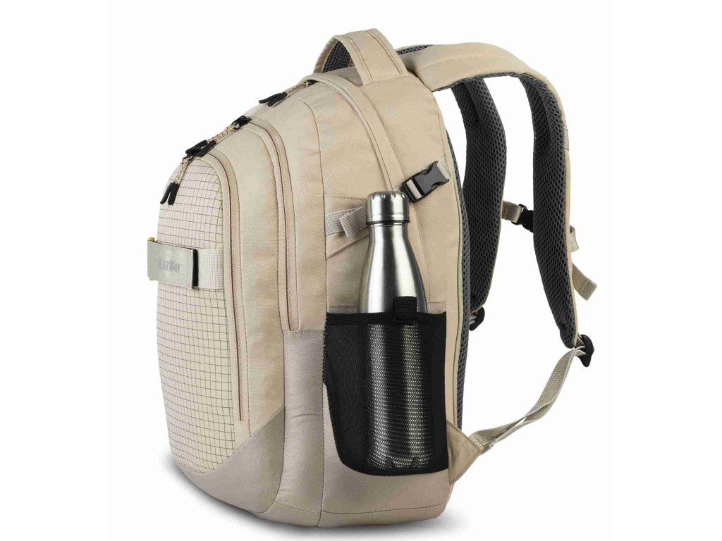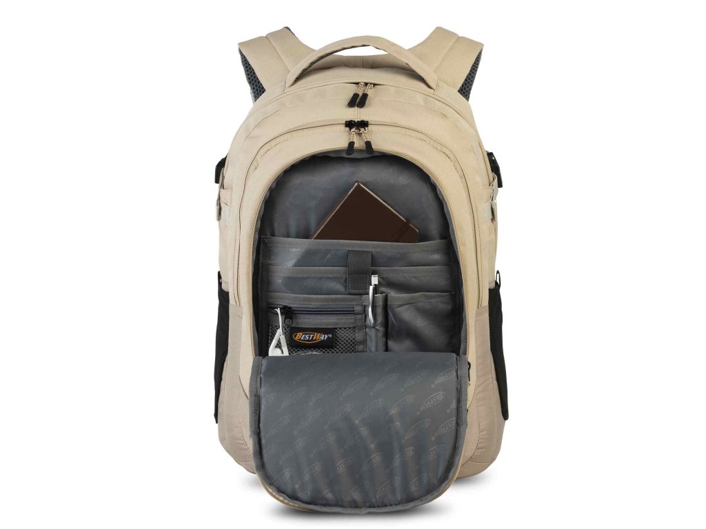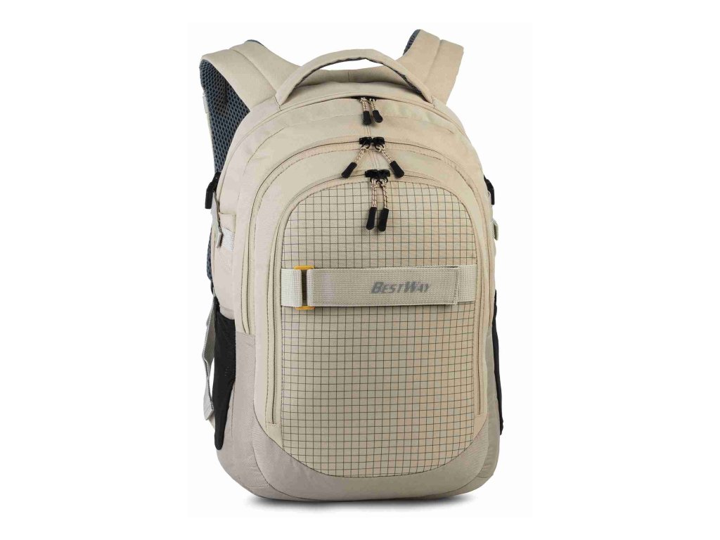 Textilní batoh německé značky Bestway v krémové barvě s potiskem čtverečků a kapsou na notebook. Kromě dvou velkých přihrádek na složky nebo organizéry a předního prostoru se zipem a praktického organizéru pro rychlý přístup k cennostem má tento batoh také samostatný oddíl na notebook se zipem. Polstrovaná záda se systémem Airflow a zesílené, individuálně nastavitelné ramenní popruhy slibují ergonomické a pohodlné nošení.