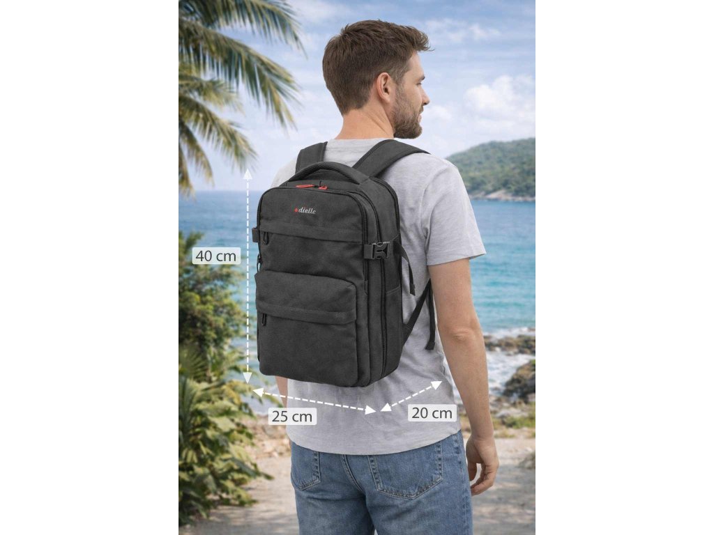 Cestovní multifunkční textilní batoh italské značky Dielle v oblíbené černé barvě. Toto palubní zavazadlo si můžete vzít s sebou do letadla, jak vyžaduje společnost Ryanair a další nízkonákladové letecké společnosti. Má rozměry 40 x 25 x 20 cm, po rozšíření 40 x 25 x 25 cm které akceptuje většina leteckých společností.