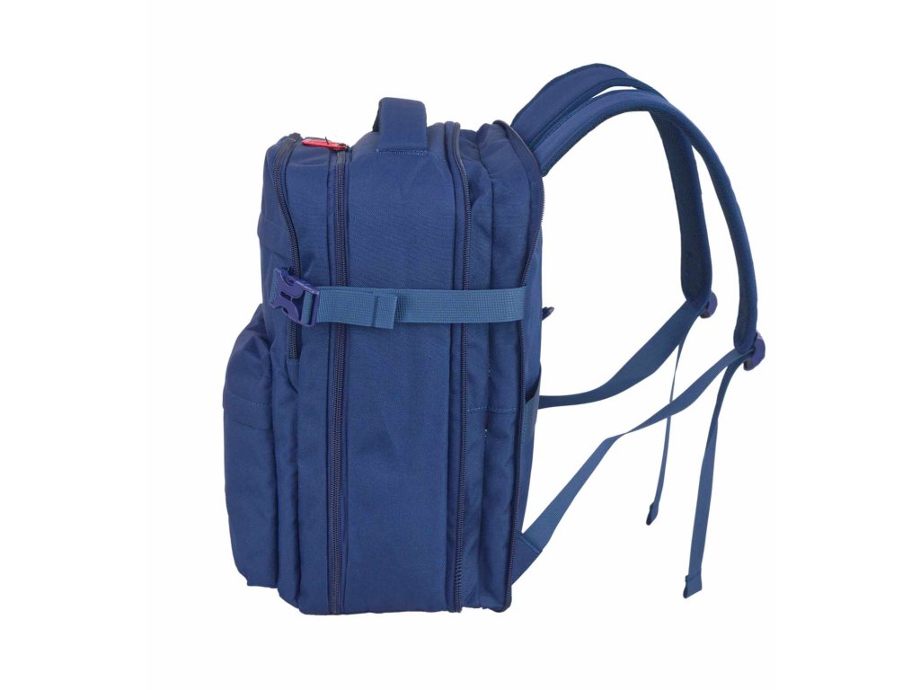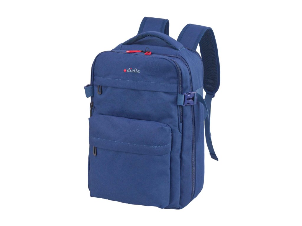 Cestovní multifunkční textilní batoh italské značky Dielle v modré barvě. Toto palubní zavazadlo si můžete vzít s sebou do letadla, ak vyžaduje společnost Ryanair a další nízkonákladové letecké společnosti. Má rozměry 40 x 25 x 20 cm, po rozšíření 40 x 25 x 25 cm které akceptuje většina leteckých společností.