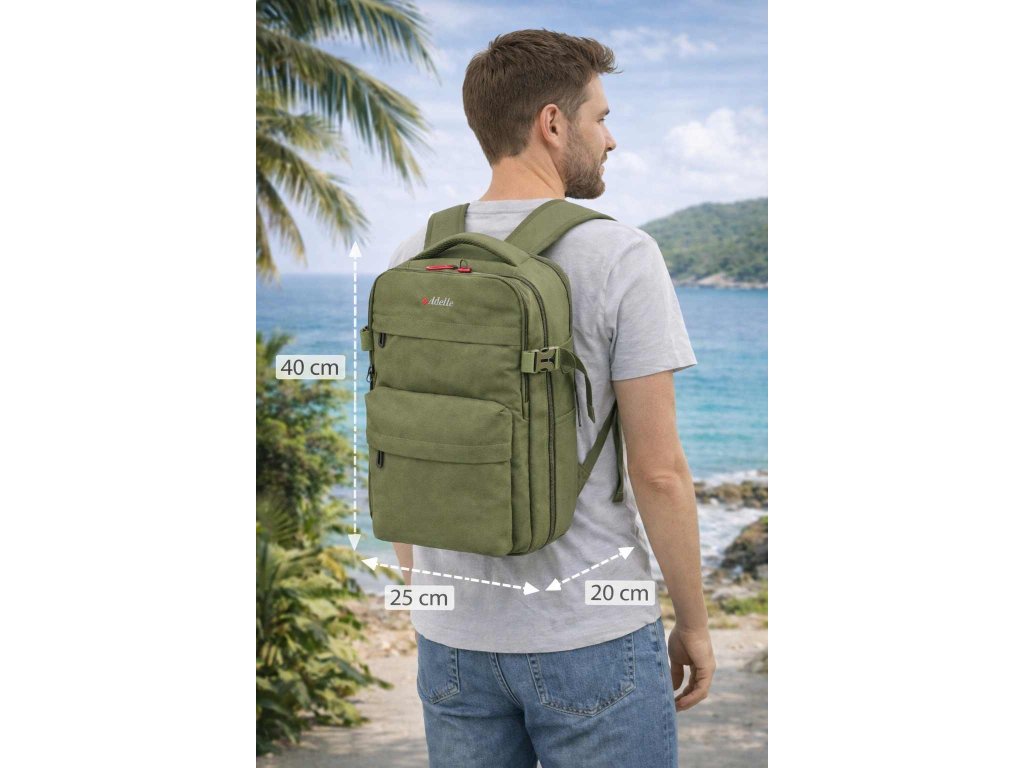 Cestovní multifunkční textilní batoh italské značky Dielle v zelené barvě. Toto palubní zavazadlo si můžete vzít s sebou do letadla, ak vyžaduje společnost Ryanair a další nízkonákladové letecké společnosti. Má rozměry 40 x 25 x 20 cm, po rozšíření 40 x 25 x 25 cm které akceptuje většina leteckých společností.