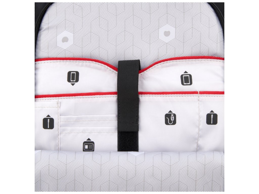 - Uvnitř hlavní i přední kapsy jsou přepážky na tablet i notebook