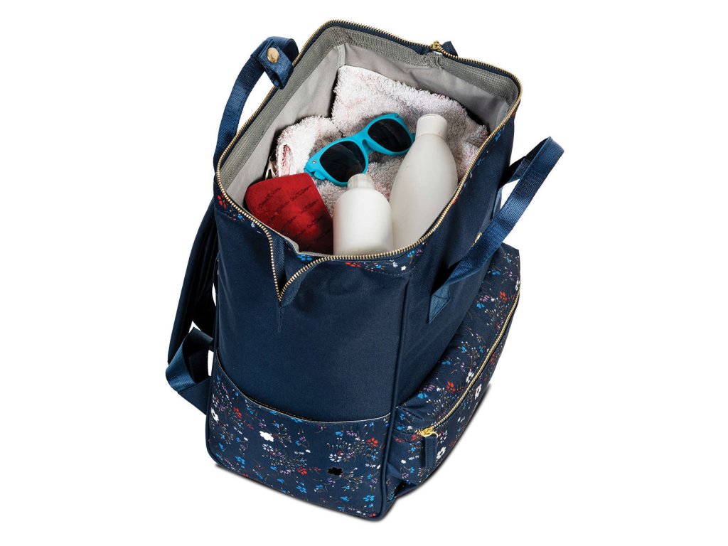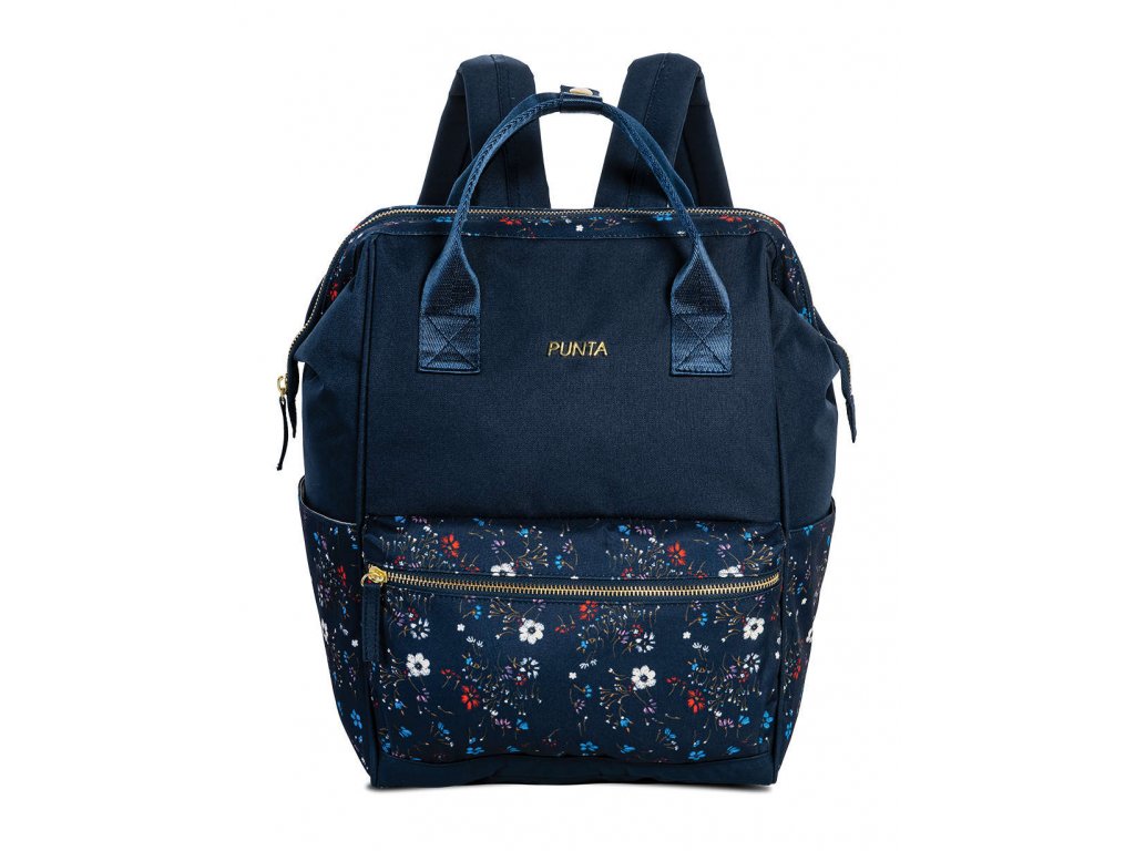 Stylový městský batoh značky Punta v oblíbené modré barvě s kytičkami. Tento trendy batoh je vhodný pro dívky i ženy. Dvě poutka pro nošení v ruce navíc představují jedinečnost ve zpracování a batoh plně nahradí kabelku.