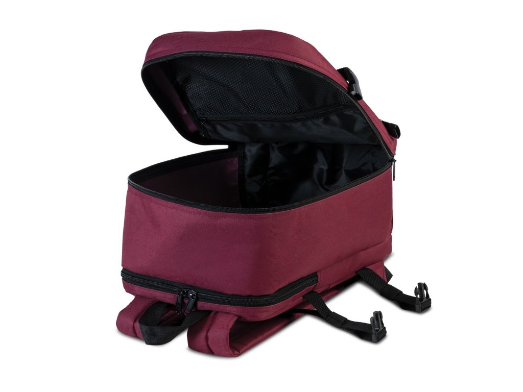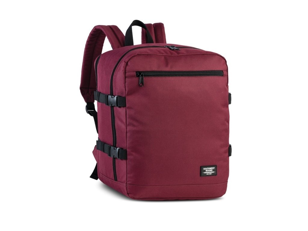 Cestovní multifunkční textilní batoh německé značky Southwest Bound v ostružinové barvě a s polstrovanou zadní kapsou na 13" notebook. Toto palubní zavazadlo si můžete vzít s sebou do letadla, jak vyžaduje společnost Ryanair. Má rozměry, které akceptuje většina leteckých společností.