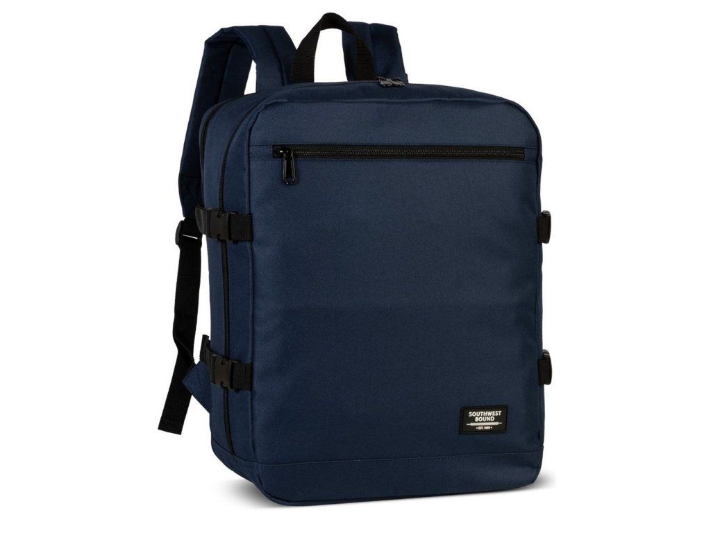 Cestovní multifunkční textilní batoh německé značky Southwest Bound v modré barvě a s polstrovanou zadní kapsou na 13" notebook. Tento batoh vyhovuje parametrům nízkonákladové letecké společnosti Ryanair, Wizzair, Vueling, Volotea a Transavia.