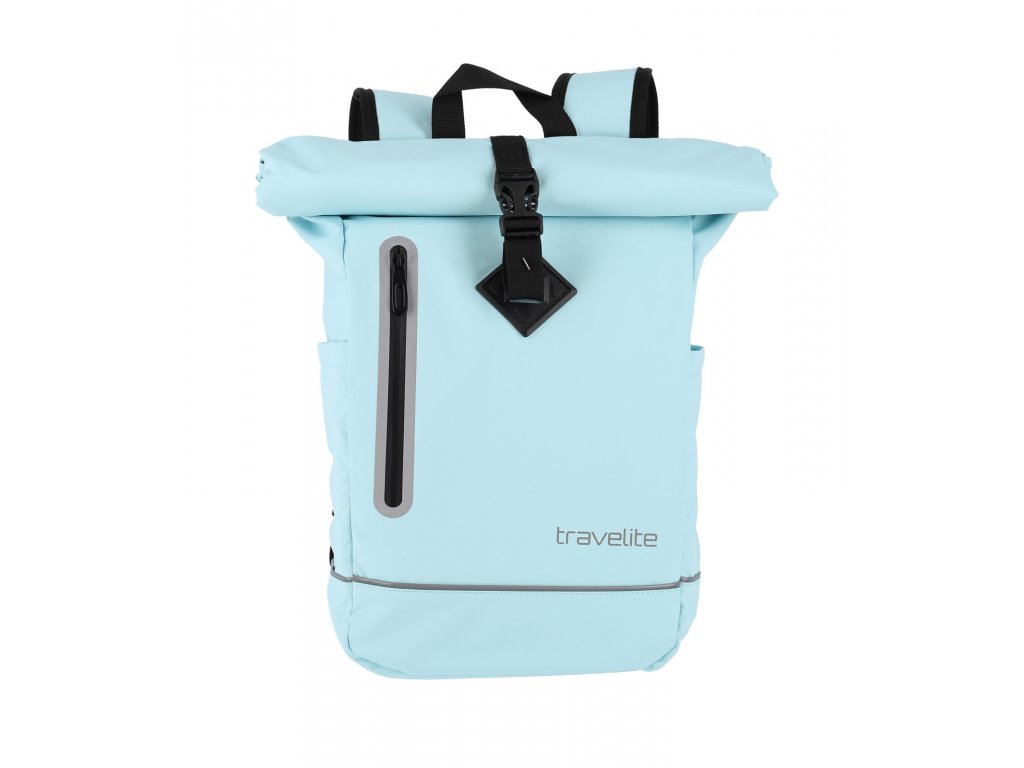 Trendy batoh německé značky Travelite v světle modré barvě s rolovacím zavíráním v pogumovaném provedení je vhodný na krátké cesty nebo do práce.