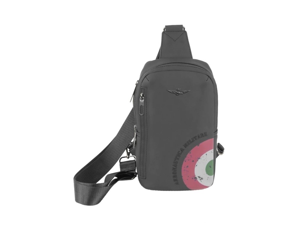 Městský elegantně - sportovní crossbody batoh od prestižní značky Aeronautica Militare série Runway v oblíbené černé barvě. Batoh lze nosit přes jedno rameno a komfortní rozměry zaručují příjemné každodenní nošení. Moderní crossbody batoh z technického pogumovaného materiálu je perfektní volbou pro ty, kteří hledají spojení funkčnosti, sportovní elegance a italského stylu. Tento stylový doplněk ztělesňuje jedinečný charakter značky Aeronautica Militare a je navržen tak, aby odolal nepříznivým povětrnostním podmínkám. Na horní části najdete decentní logo značky, zatímco spodní část zdobí výrazná grafika s motivem italské trikolóry a nápisem Aeronautica Militare, které podtrhují její exkluzivní vzhled.