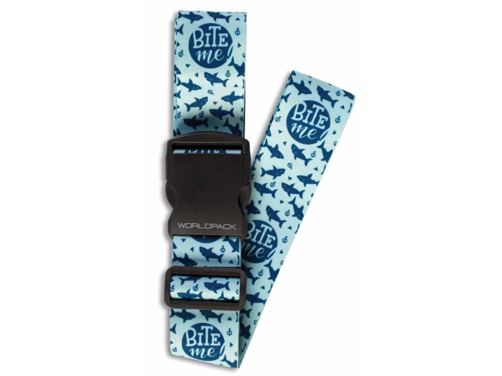 Popruh na cestovní kufr značky Fabrizio v mint světle zelené barvě s potiskem modrých žraloků a napisem BITE me! Popruh lépe chrání obsah vašeho kufru. Je dostatečně dlouhý a přizpůsobivý. Slouží také jako identifikátor Vašeho zavazadla.