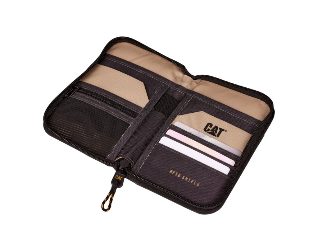 Praktická cestovní peněženka CAT City Bizz Travel udrží vaše doklady, platební karty i další nezbytnosti bezpečně pohromadě. Díky RFID ochraně zabrání nechtěnému skenování karet či pasů. Uvnitř je místo až pro dva pasy a čtyři platební karty, nechybí pružné poutko na propisku a síťovaná kapsa na zip pro drobnosti. Zadní otevřená kapsa pojme například letenku, takže ji budete mít vždy po ruce. Peněženka je vyrobena z odolného recyklovaného polyesteru a zdobí ji hypalonová nášivka s logem CAT.