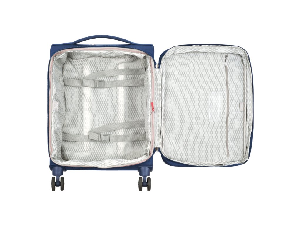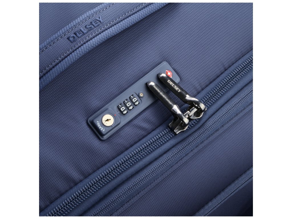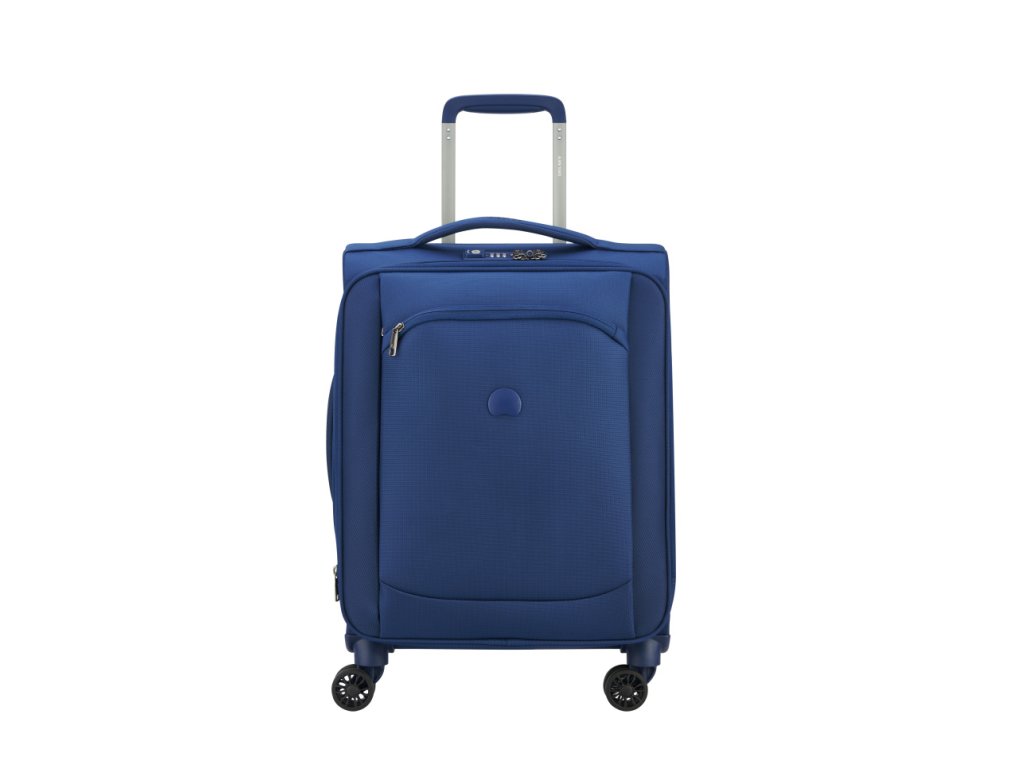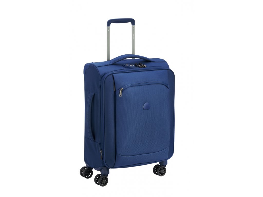 Menší cestovní textilní kufr se čtyřmi otočnými dvojkolečky francouzské špičkové značky Delsey v moderní modré barvě. Zavazadla Delsey jsou pravidelně podrobována nejnáročnějším testům, aby splňovala náročná kritéria zákazníků a jejich spokojenost byla na prvním místě. Precizní zpracování a kvalitní užité materiály jsou doménou této luxusní značky.