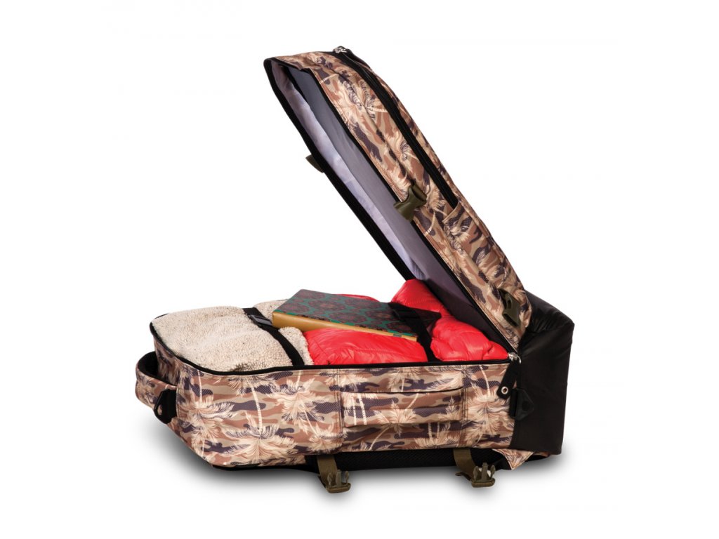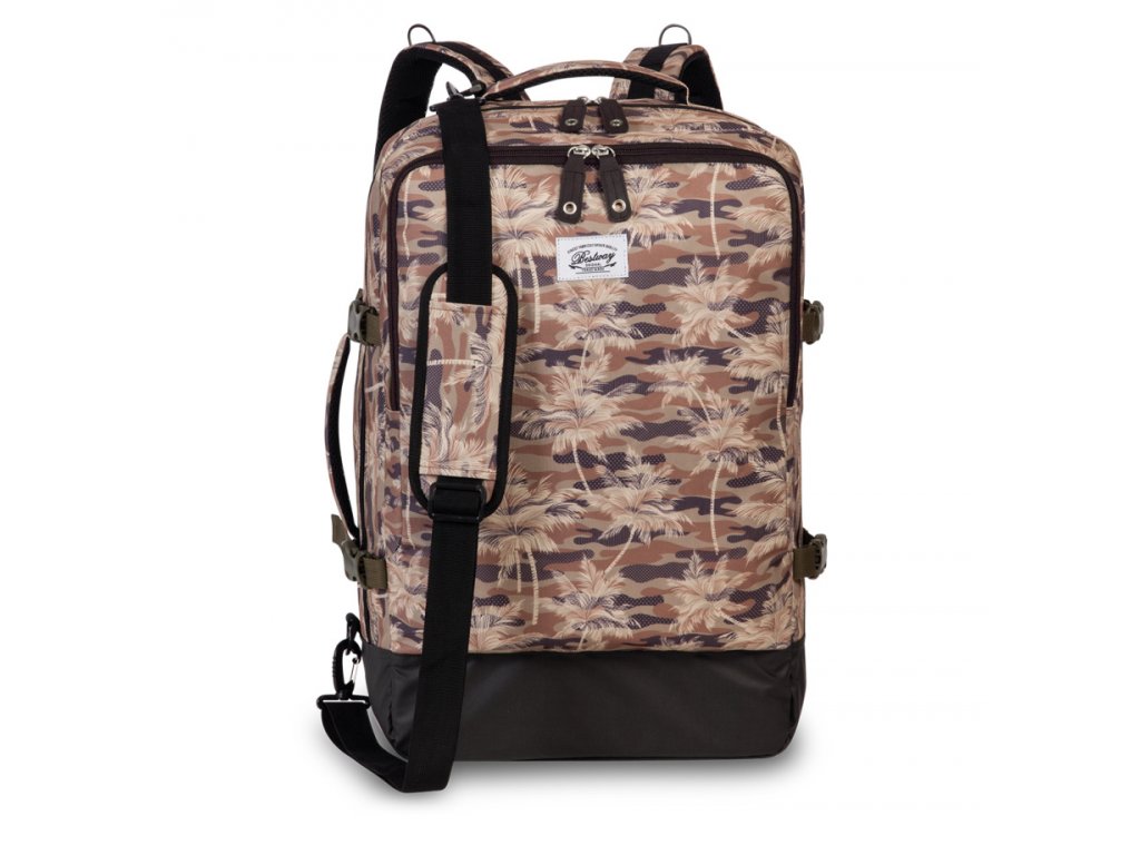 Cestovní multifunkční textilní batoh německé značky Bestway v hnědých barvách s motivem palem. Tento praktický batoh má velikost jako malý cestovní kufr, tudíž je považován jako kabinový a můžete ho vzít s sebou na palubu do letadla.