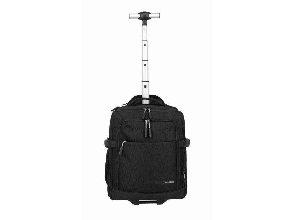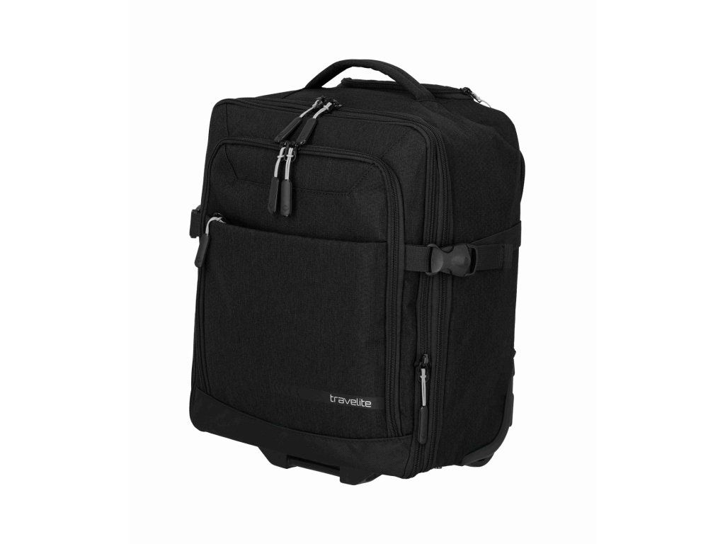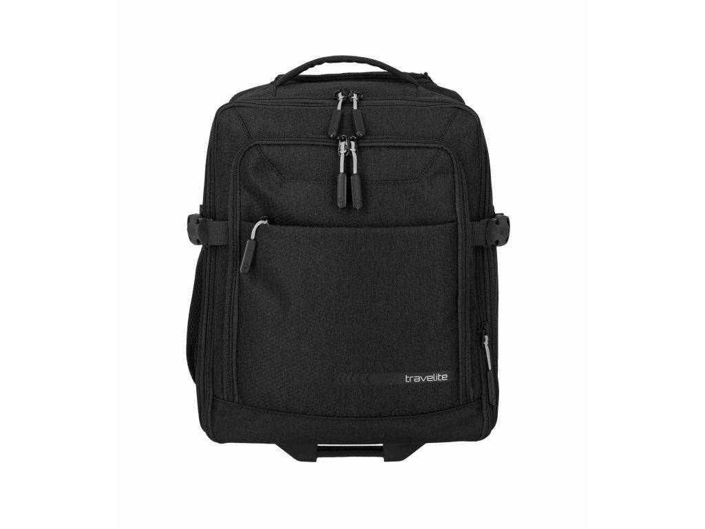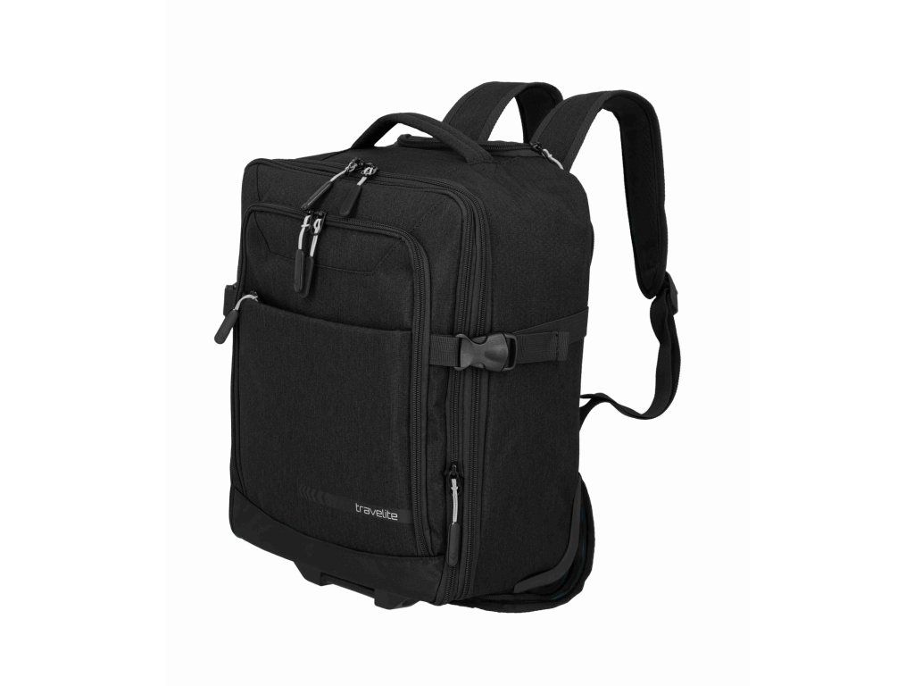 Batoh na kolečkách z kolekce německé značky Travelite série KICK OFF v oblíbené černé barvě. Cestovní batoh na kolečkách Travelite KICK OFF Wizz air je praktický společník na krátké cesty, služební i víkendové výlety, kdy chcete cestovat nalehko, ale mít ve věcech pořádek. Funguje jako 2 v 1 – můžete ho pohodlně táhnout za vysouvací teleskopickou rukojeť na dvou kolečkách, nebo během chvíle nasadit polstrované ramenní popruhy a nést ho jako klasický batoh, přičemž popruhy lze schovat, aby nepřekážely při tažení. Rozměrově je navržen tak, aby splňoval požadavky na příruční zavazadlo u Ryanair, Wizz air, Vueling, Volotea a Transavia, takže se skvěle hodí jako kabinové zavazadlo, když nechcete odbavovat kufr. Hlavní komora se otevírá širokým zipem jako kufr, takže máte perfektní přehled o obsahu, uvnitř jsou fixační popruhy na zajištění oblečení a samostatná kapsa vhodná na notebook nebo dokumenty. V přední části je přehledný organizér na doklady, mobil, pera, nabíječky i cestovní lístky, po stranách pak síťované kapsy na láhev nebo deštník, takže máte vše důležité vždy po ruce. Odolný materiál v univerzálním černém provedení působí nenápadně elegantně a hodí se jak k volnočasovému oblečení, tak k byznys outfitu, robustní kolečka a chráněné rohy lépe snášejí časté cestování. O pohodlí při manipulaci se stará teleskopická rukojeť s nastavitelnou výškou, horní madlo pro rychlé přenášení, polstrované ramenní popruhy při nošení na zádech a vnější kompresní popruhy, kterými snadno stáhnete objem, když batoh není zcela plný. Výsledkem je univerzální cestovní zavazadlo, které si vezmete do letadla, projdete s ním bez námahy letiště i město a přitom v něm budete mít pořádek jako v malém kufru.