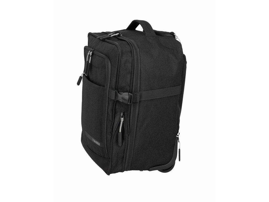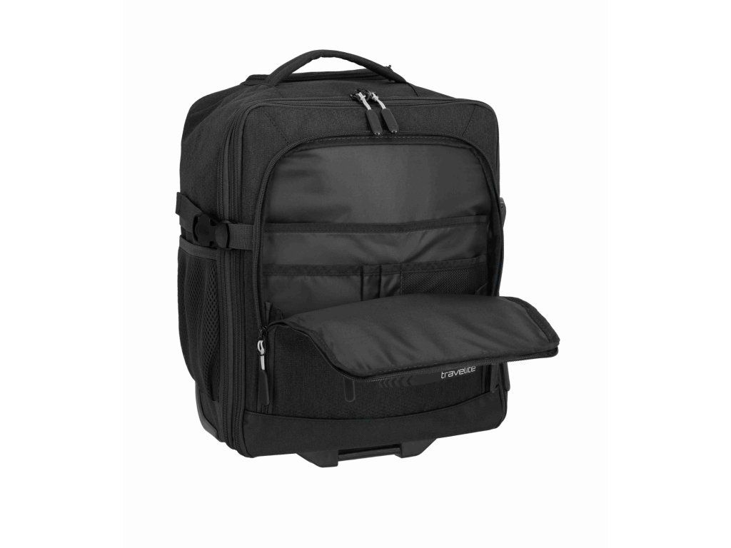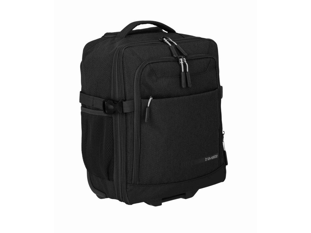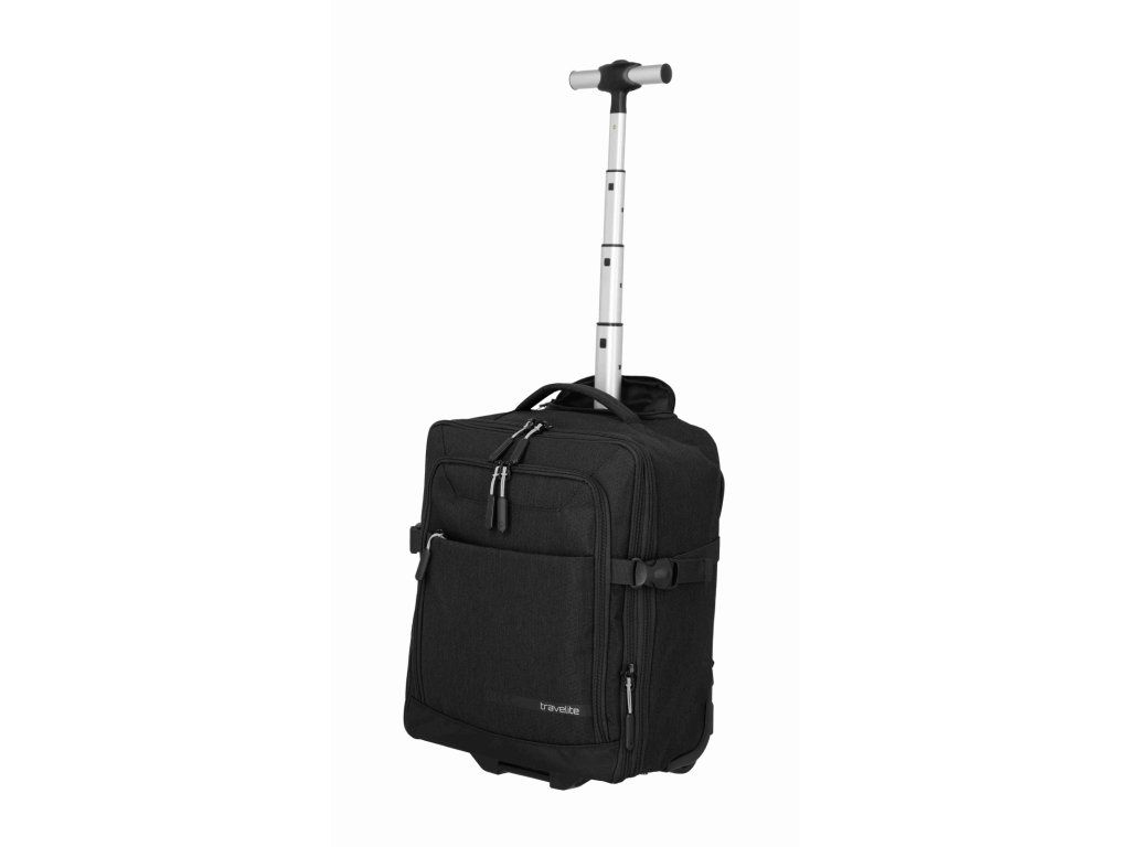 Batoh na kolečkách z kolekce německé značky Travelite série KICK OFF v oblíbené černé barvě. Cestovní batoh na kolečkách Travelite KICK OFF Wizz air je praktický společník na krátké cesty, služební i víkendové výlety, kdy chcete cestovat nalehko, ale mít ve věcech pořádek. Funguje jako 2 v 1 – můžete ho pohodlně táhnout za vysouvací teleskopickou rukojeť na dvou kolečkách, nebo během chvíle nasadit polstrované ramenní popruhy a nést ho jako klasický batoh, přičemž popruhy lze schovat, aby nepřekážely při tažení. Rozměrově je navržen tak, aby splňoval požadavky na příruční zavazadlo u Ryanair, Wizz air, Vueling, Volotea a Transavia, takže se skvěle hodí jako kabinové zavazadlo, když nechcete odbavovat kufr. Hlavní komora se otevírá širokým zipem jako kufr, takže máte perfektní přehled o obsahu, uvnitř jsou fixační popruhy na zajištění oblečení a samostatná kapsa vhodná na notebook nebo dokumenty. V přední části je přehledný organizér na doklady, mobil, pera, nabíječky i cestovní lístky, po stranách pak síťované kapsy na láhev nebo deštník, takže máte vše důležité vždy po ruce. Odolný materiál v univerzálním černém provedení působí nenápadně elegantně a hodí se jak k volnočasovému oblečení, tak k byznys outfitu, robustní kolečka a chráněné rohy lépe snášejí časté cestování. O pohodlí při manipulaci se stará teleskopická rukojeť s nastavitelnou výškou, horní madlo pro rychlé přenášení, polstrované ramenní popruhy při nošení na zádech a vnější kompresní popruhy, kterými snadno stáhnete objem, když batoh není zcela plný. Výsledkem je univerzální cestovní zavazadlo, které si vezmete do letadla, projdete s ním bez námahy letiště i město a přitom v něm budete mít pořádek jako v malém kufru.