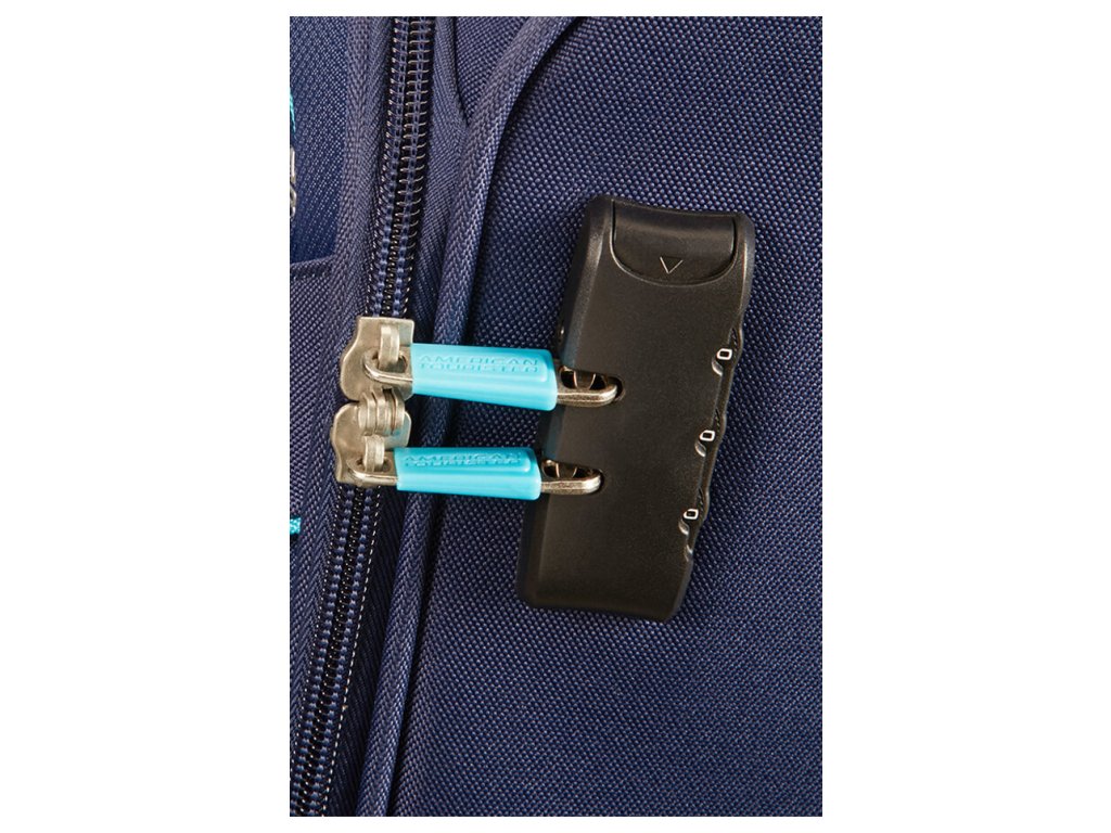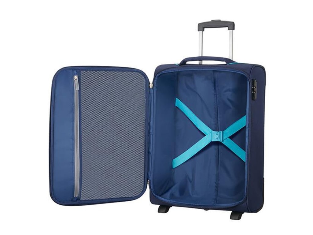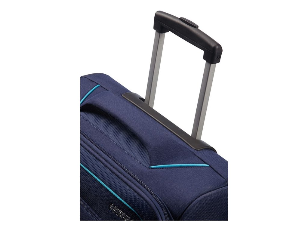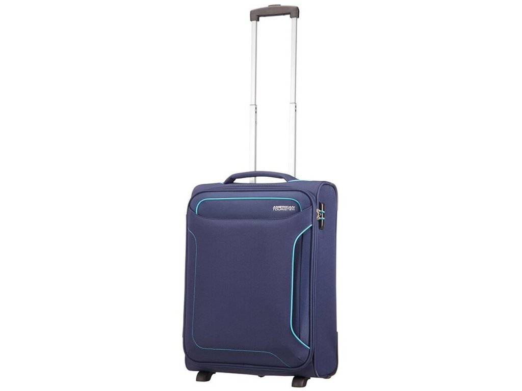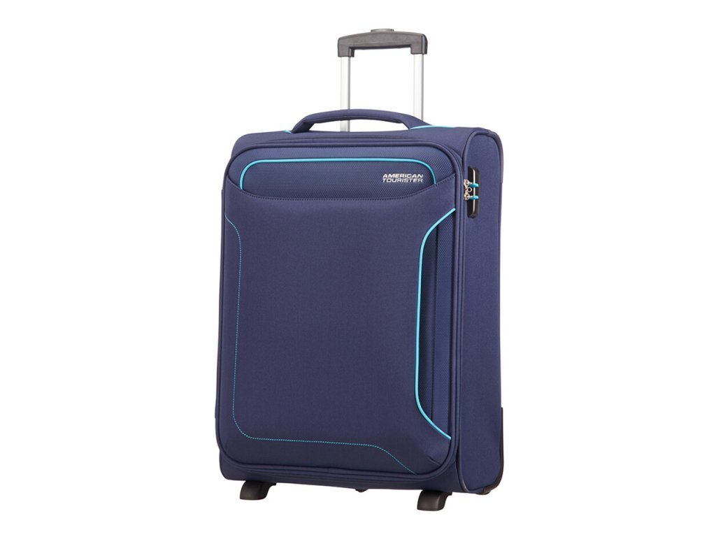 Cestovní kabinový kufr American Tourister linie Holiday Heat 55 cm v tmavší modré barvě, dvě kolečka, kombinační zámek. Tato linie je inspirována teplem slunce, má moderní, sportovní vzhled s detaily jako jsou barevné akcenty na švech a barevné přizpůsobené zipy.