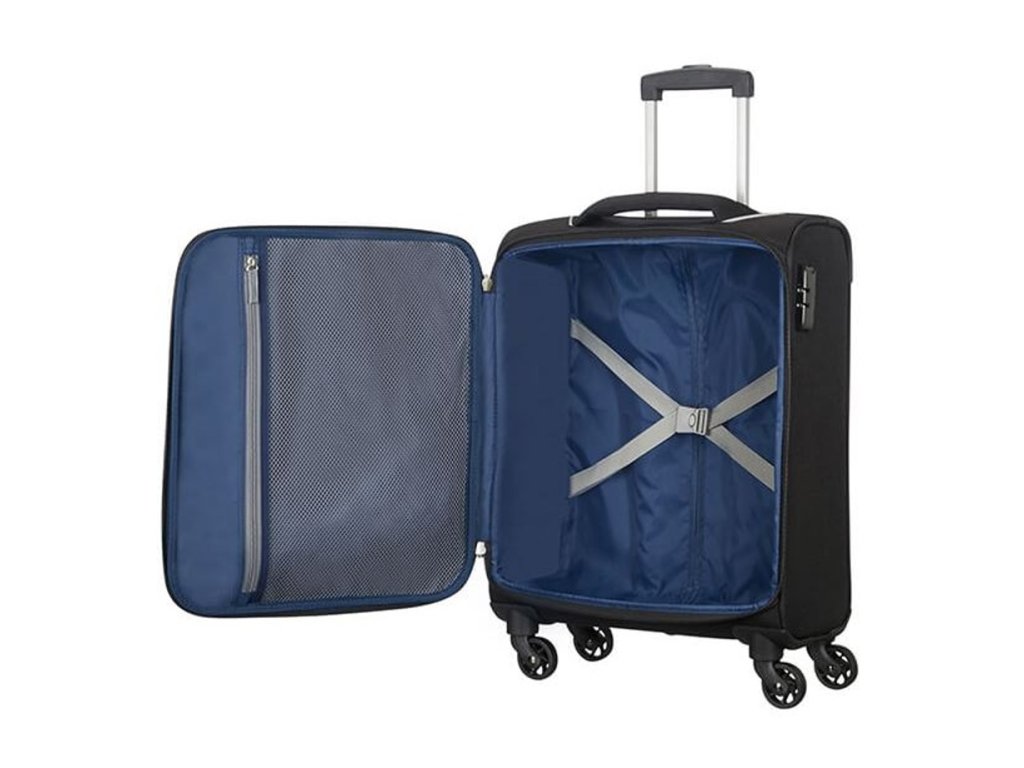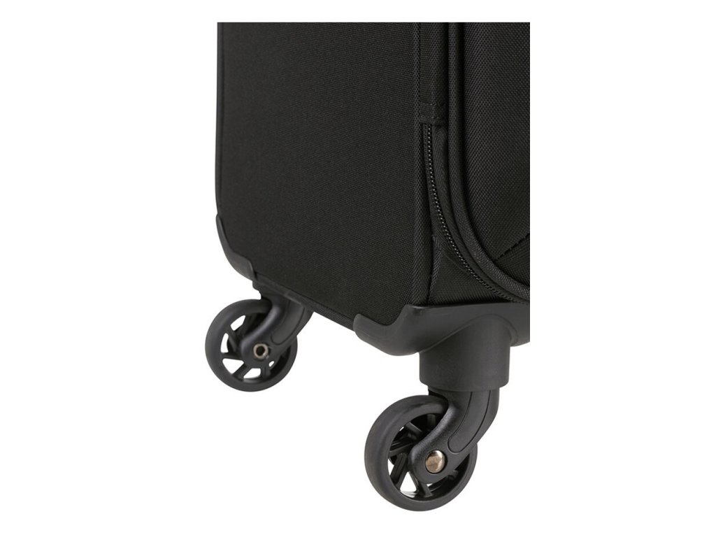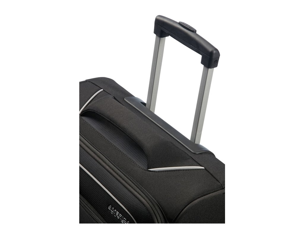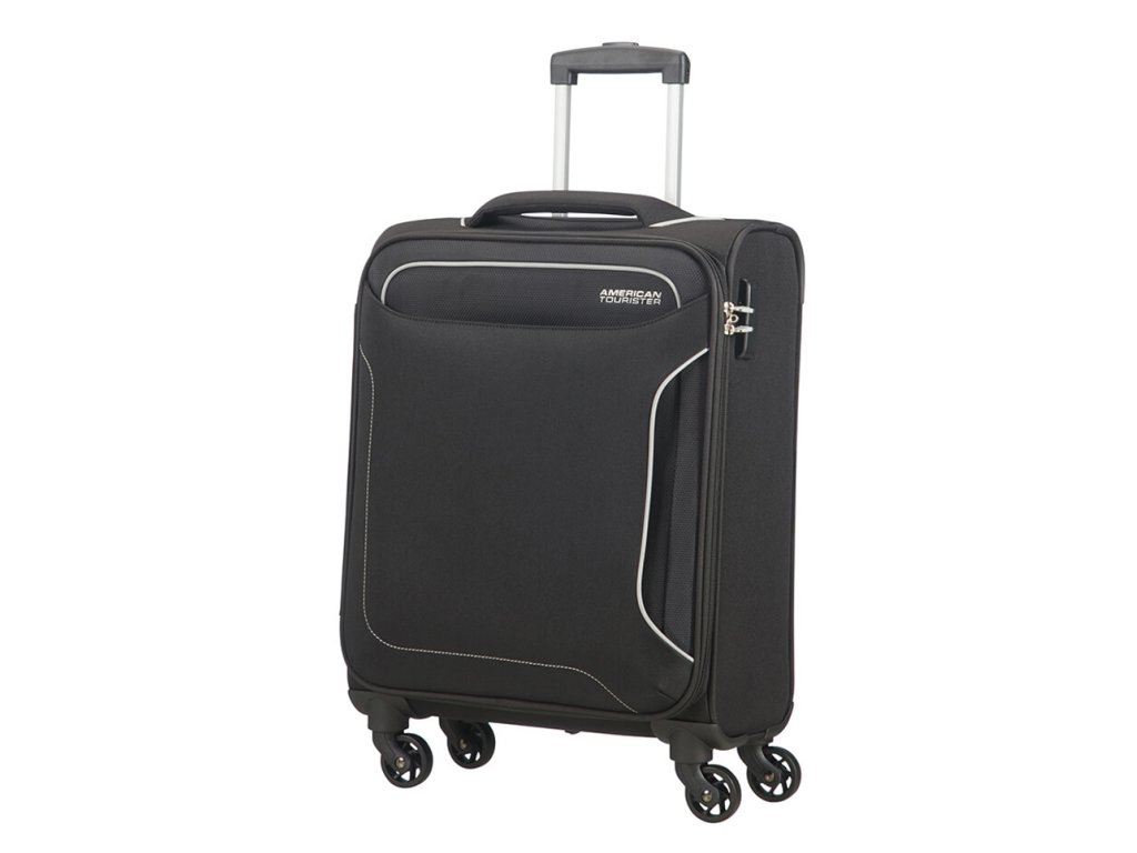 Cestovní kabinový kufr American Tourister linie Holiday Heat 55 cm v černé barvě, čtyři kolečka, kombinační zámek. Tato linie je inspirována teplem slunce, má moderní, sportovní vzhled s detaily jako jsou barevné akcenty na švech a barevné přizpůsobené zipy.