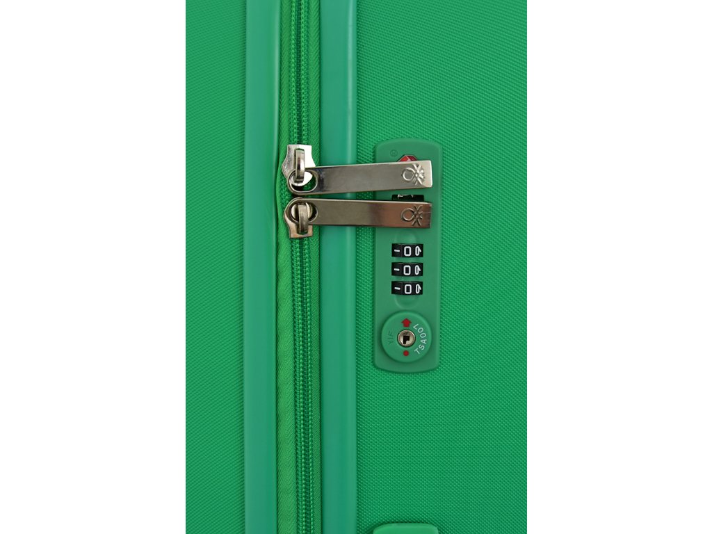 Cestovní skořepinový kufr italské proslulé značky United Colors of Benetton v zelené barvě. Plastové kufry Benetton vynikají kombinací dvou materiálů, ABS a polykarbonátu. ABS zajišťuje odolnost vůči poškození a polykarbonát se postará o pružnost kufru. Atraktivní vzhled kufru jde ruku v ruce s dnešní moderní dobou.