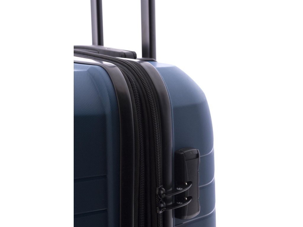 - Plně integrovaný kombinační zámek na zamknutí jezdců zipu na boční straně kufru.