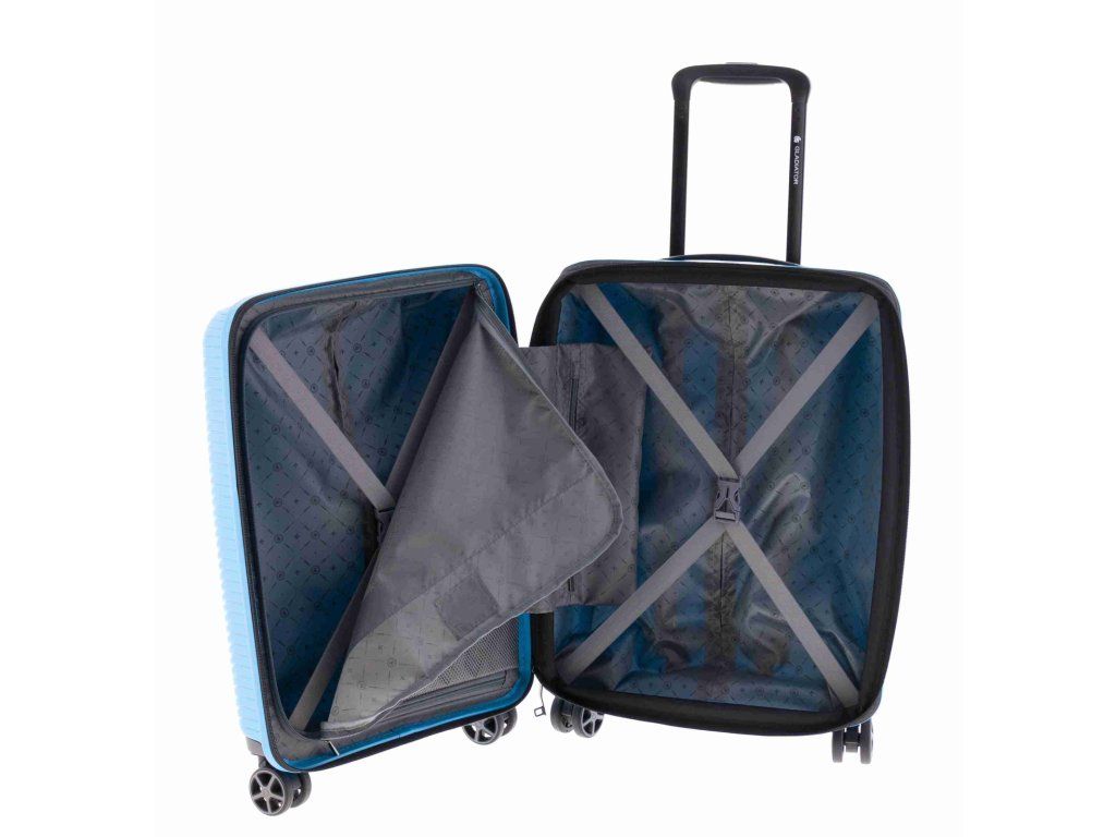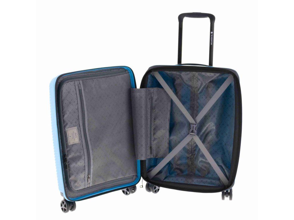 Moderní plastový kufr 55 cm španělské značky Gladiator linie Vincent s prolisy ve světle modré barvě. Kolekce Vincent, inspirovaná genialitou Vincenta van Gogha, vdechuje umění život v pohybu. Je vyrobena ze superodolného polypropylenu a kombinuje lehkost, odolnost a texturovaný design přední strany, který odráží živé tahy štětcem nizozemského mistra. Díky špičkovému systému zipů a rozšiřitelným funkcím spojuje praktičnost se stylem v kusu navrženém tak, aby vydržel a vynikl.