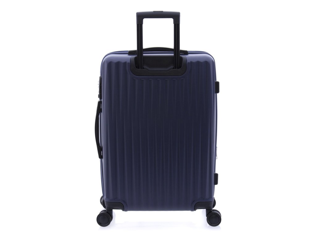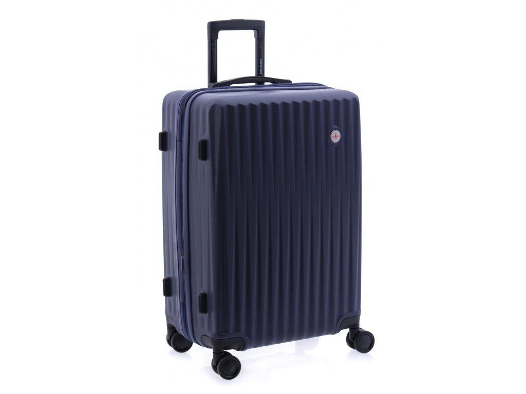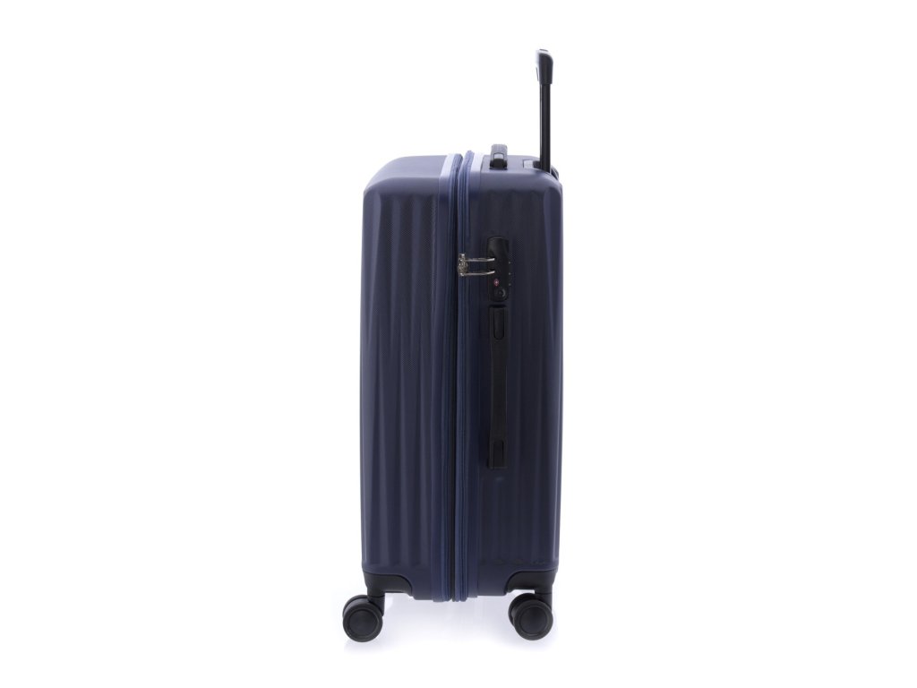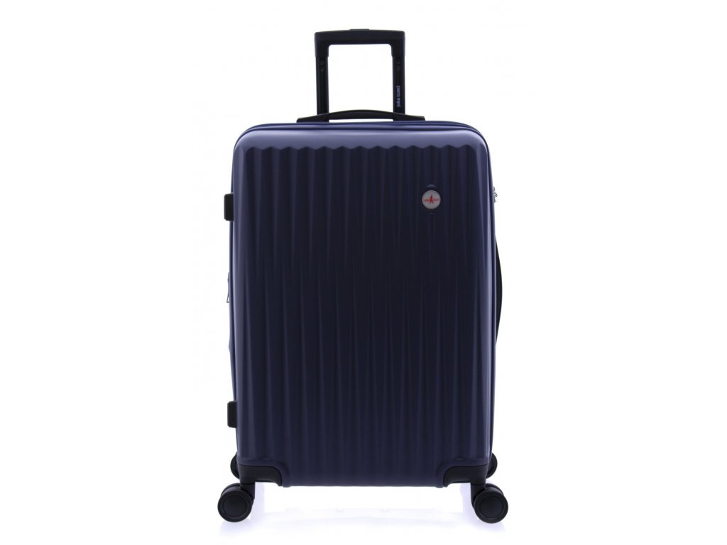 Elegantní plastový kufr 65 cm španělské značky John Travel v tmavě modré barvě linie Diamond s prolisy proužky. Tento cestovní kufr je vyroben z ABS materiálu.