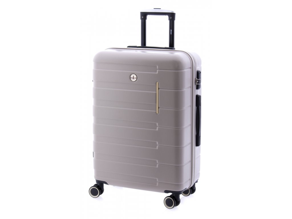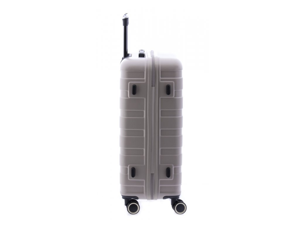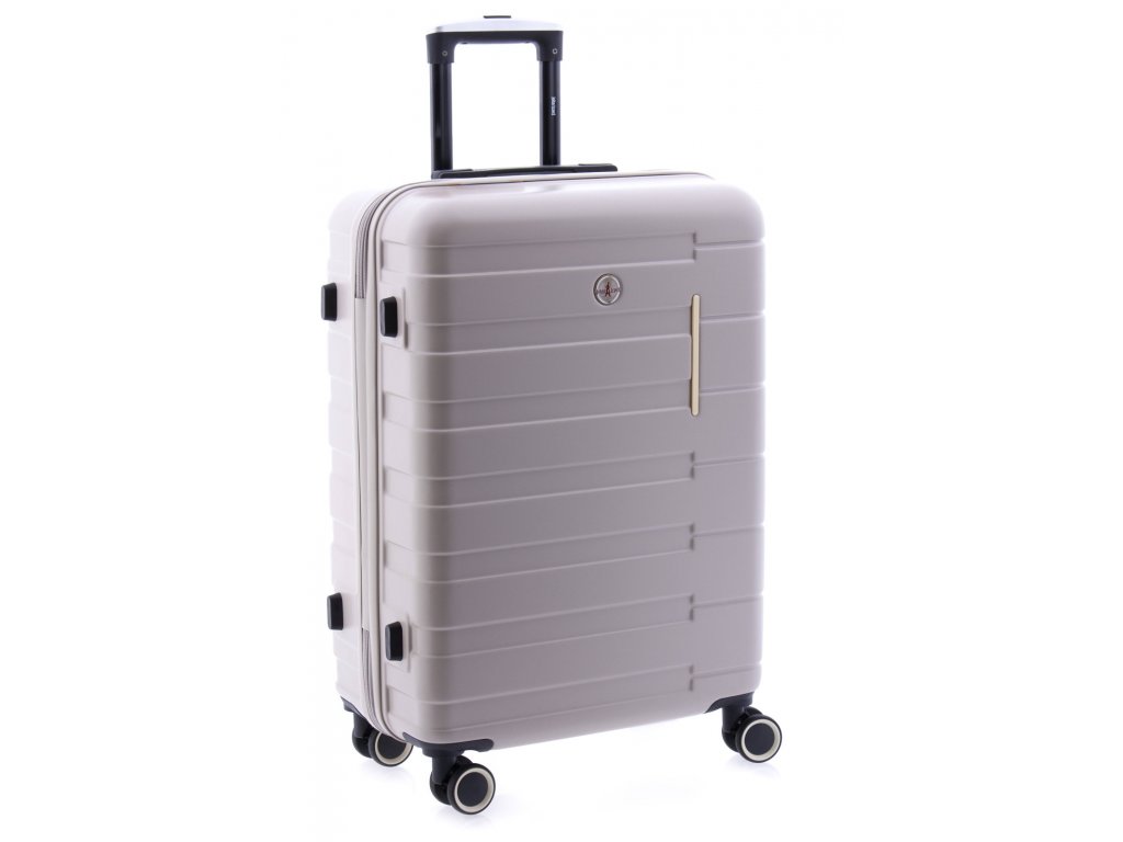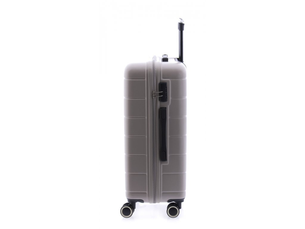Elegantní plastový kufr 66 cm španělské značky John Travel v béžové barvě linie Marshal s prolisy proužky. Tento cestovní kufr je vyroben z ABS materiálu.