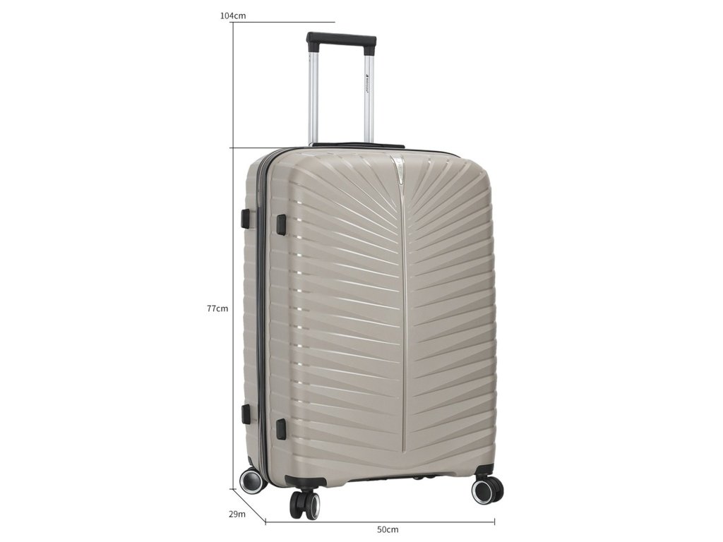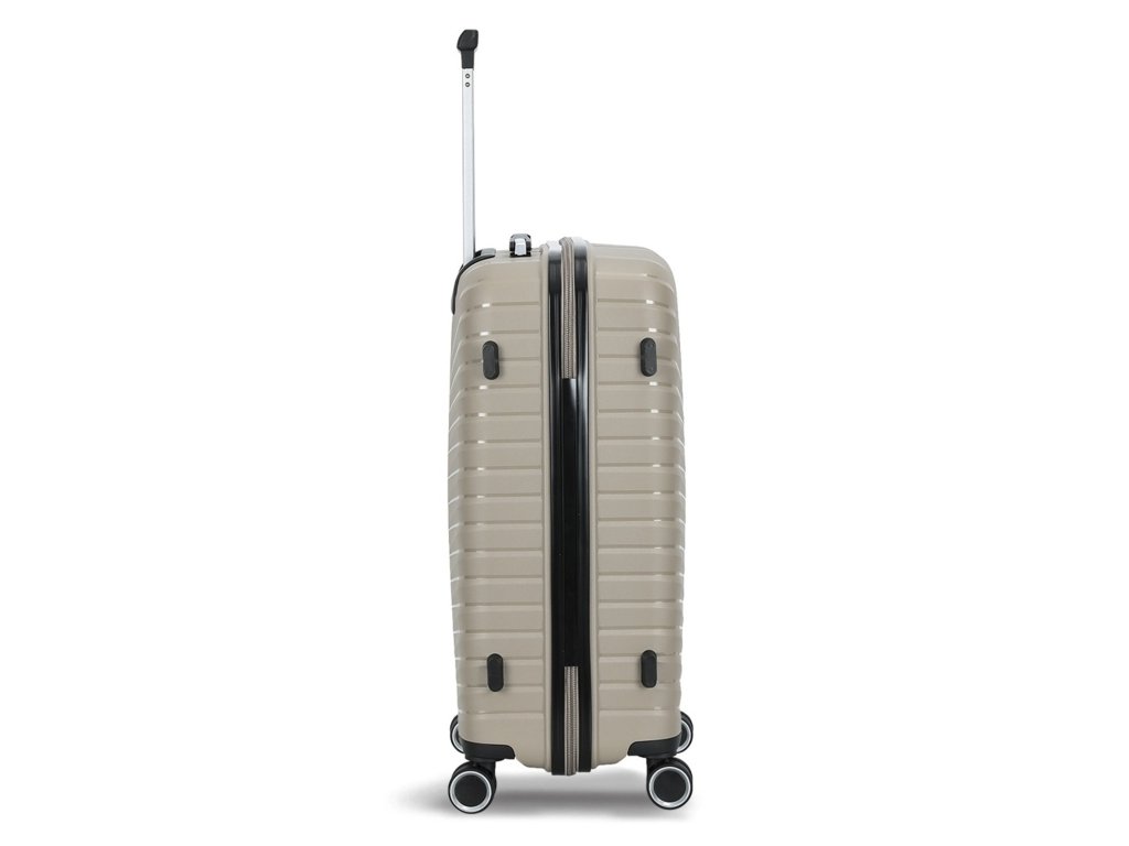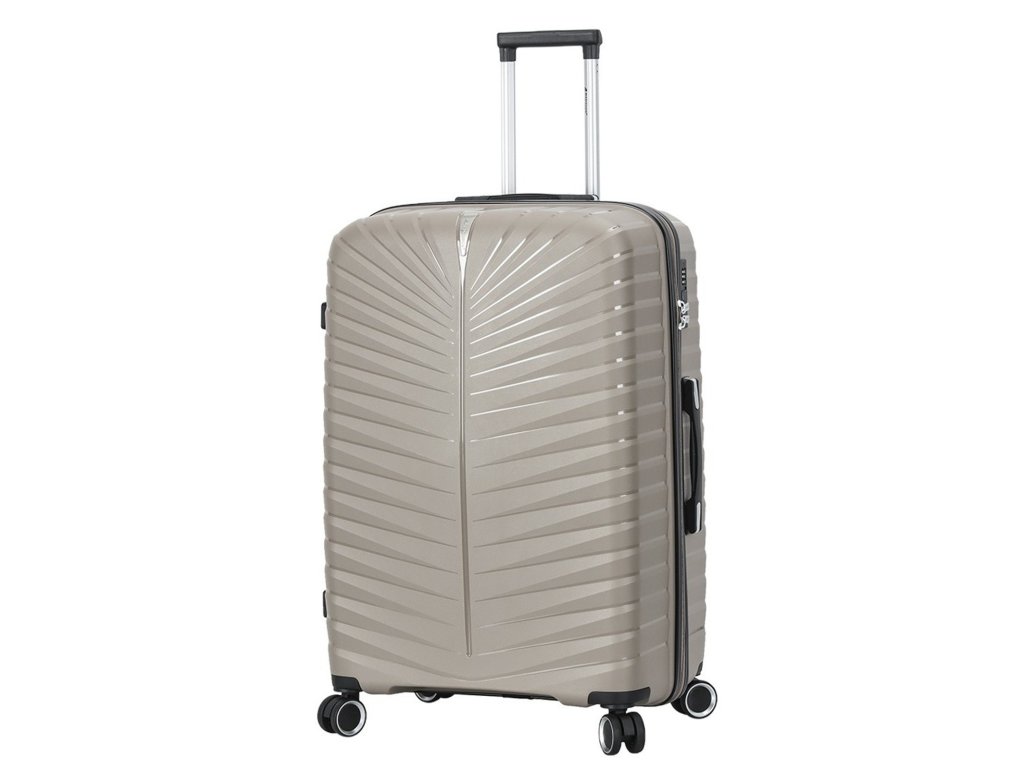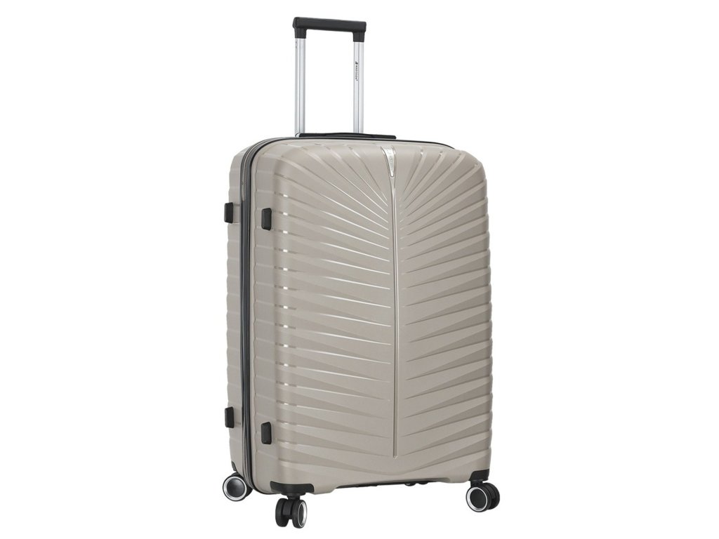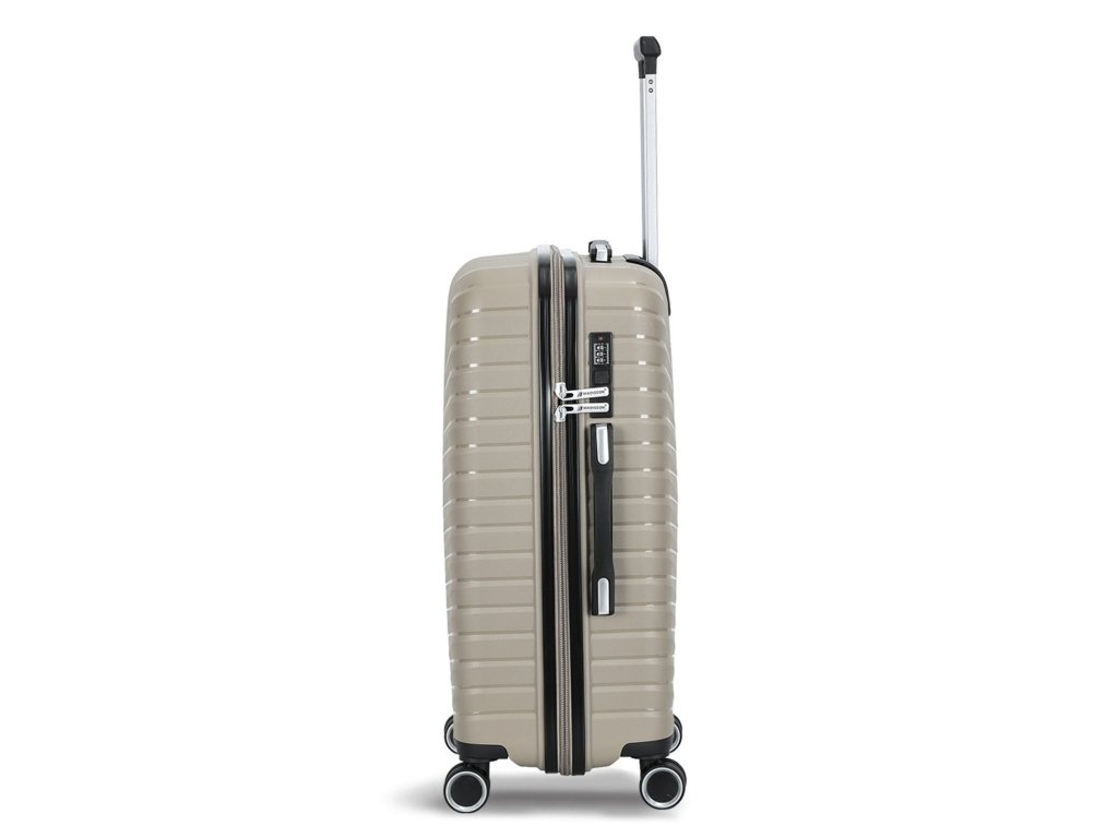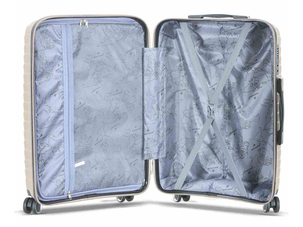 Cestovní kufr 77 cm francouzské značky Madisson v šampaňské barvě. Polypropylenový kufr Madisson nabízí hned řadu výhod, a to nízkou hmotnost, téměř nulovou rozbitnost, cenovou dostupnost pro každého, solidní zpracování a v neposlední řadě také elegantní a moderní drážkovaný vzhled.