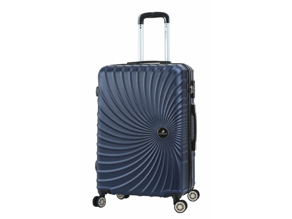 Skořepinový cestovní kufr 67 cm francouzské značky Madisson na 4 dvojitých kolečkách v tmavě modré barvě vyniká elegantním spirálovým designem, který dodává celému kufru jedinečný vzhled. Vyrobený z odolného ABS plastu, poskytuje spolehlivou ochranu vašim věcem a zároveň si zachovává nízkou hmotnost pro pohodlné cestování. Na kruhovém detailu je umístěno decentní logo značky.