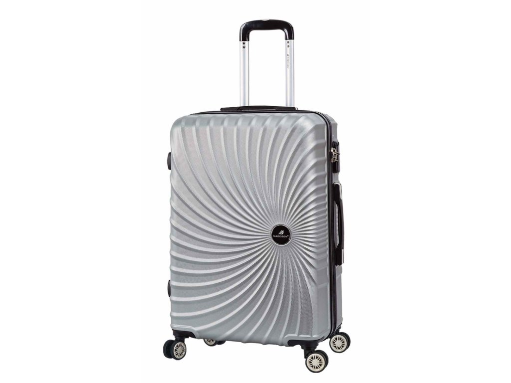 Skořepinový cestovní kufr 67 cm francouzské značky Madisson na 4 dvojitých kolečkách ve světle šedé barvě vyniká elegantním spirálovým designem, který dodává celému kufru jedinečný vzhled. Vyrobený z odolného ABS plastu, poskytuje spolehlivou ochranu vašim věcem a zároveň si zachovává nízkou hmotnost pro pohodlné cestování. Na kruhovém detailu je umístěno decentní logo značky.