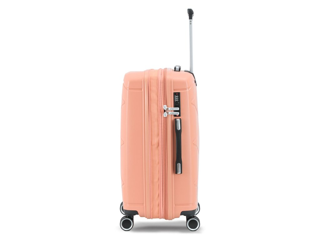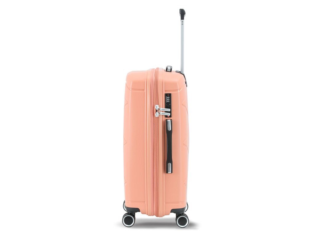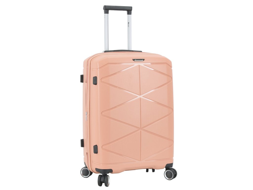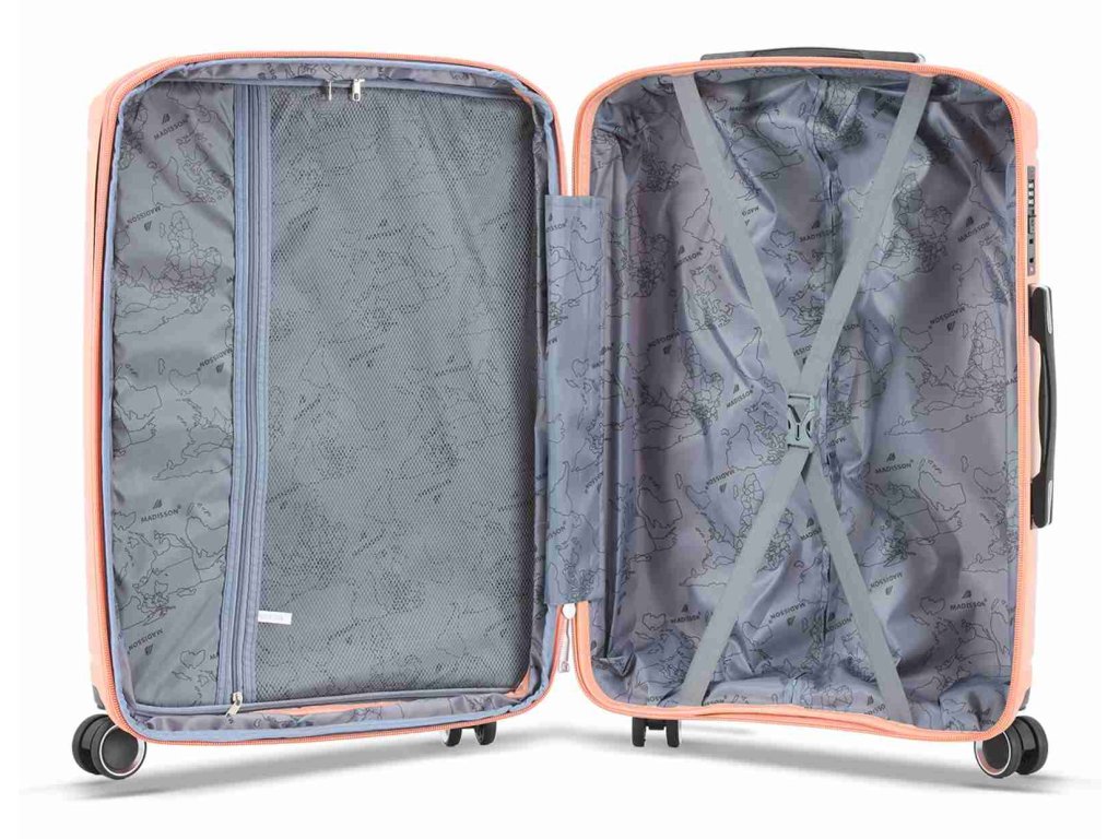 Cestovní kufr 75 cm francouzské značky Madisson ve zlato růžové barvě. Polypropylenový kufr Madisson nabízí hned řadu výhod, a to nízkou hmotnost, téměř nulovou rozbitnost, cenovou dostupnost pro každého, solidní zpracování a v neposlední řadě také elegantní a moderní drážkovaný vzhled.